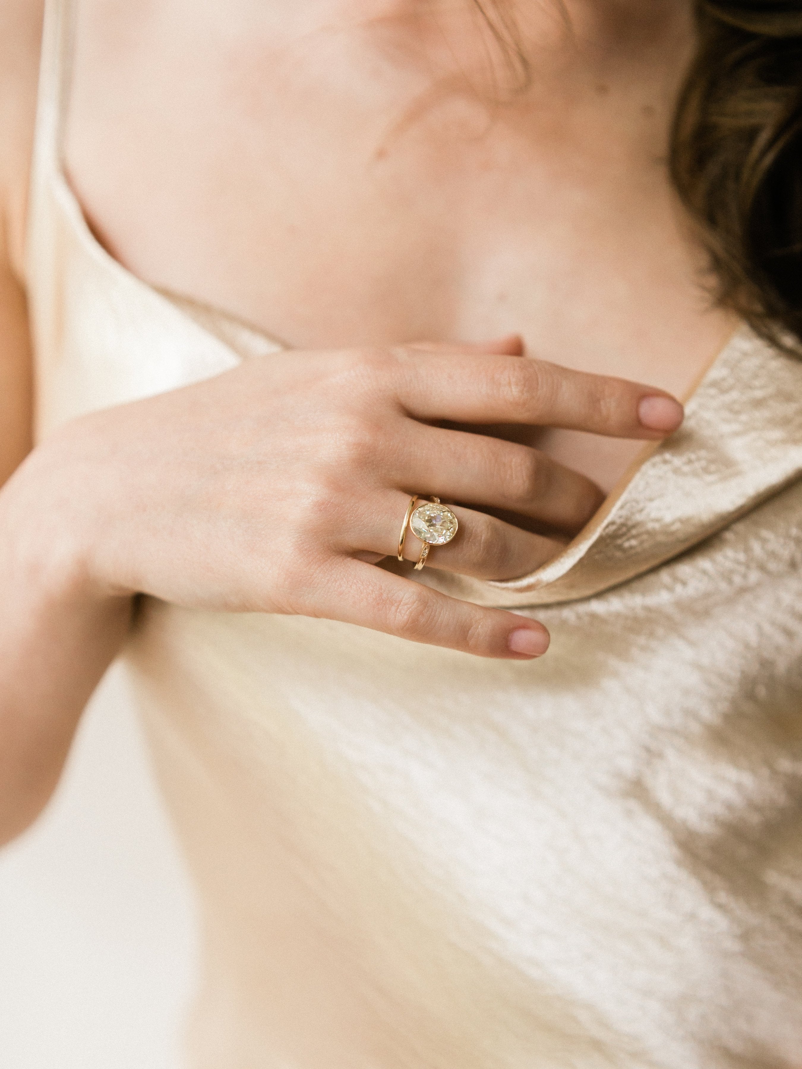 This diamond is unlike any other! A gorgeous oval shape with gorgeous facets that draw your eye into this large and lovely stone! The color is warm and sunny and just glows in the clean bezel setting with the extra light coming in through the open gallery!