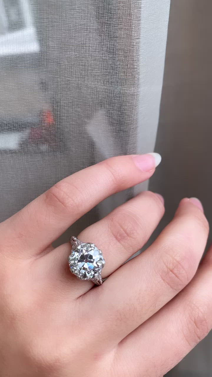 This amazing ring is a Vintage Edwardian Engagement Ring circa 1915. This ring centers a GIA Certified 5.01 carat old mine cut diamond of K color, VS2 clarity. The diamond is set in an 8-prong gorgeous platinum setting with 42 small diamonds set throughout. The ring is currently size 7.25 and can be resized!