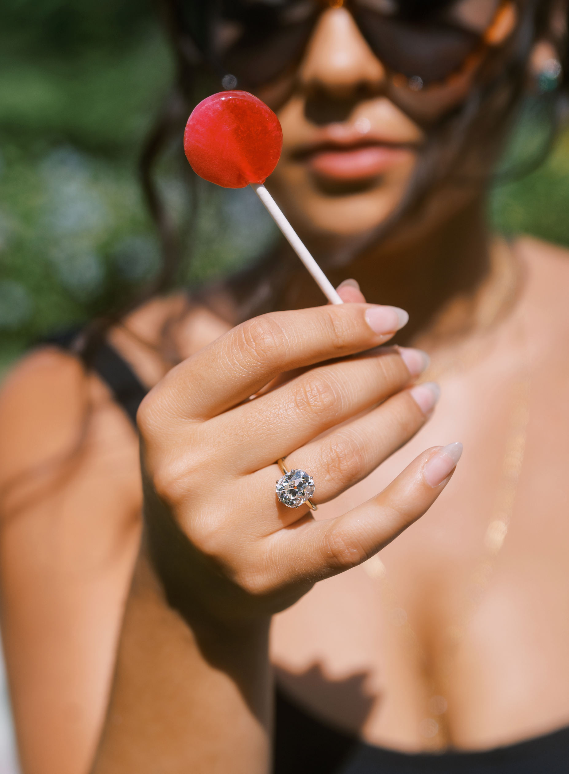 *THE DREAM OMC* centers this timeless solitaire. A perfect pillowy shape, slightly elongated with those chunky facets, this Emmy ring is perfect for a big look in a minimalist setting.