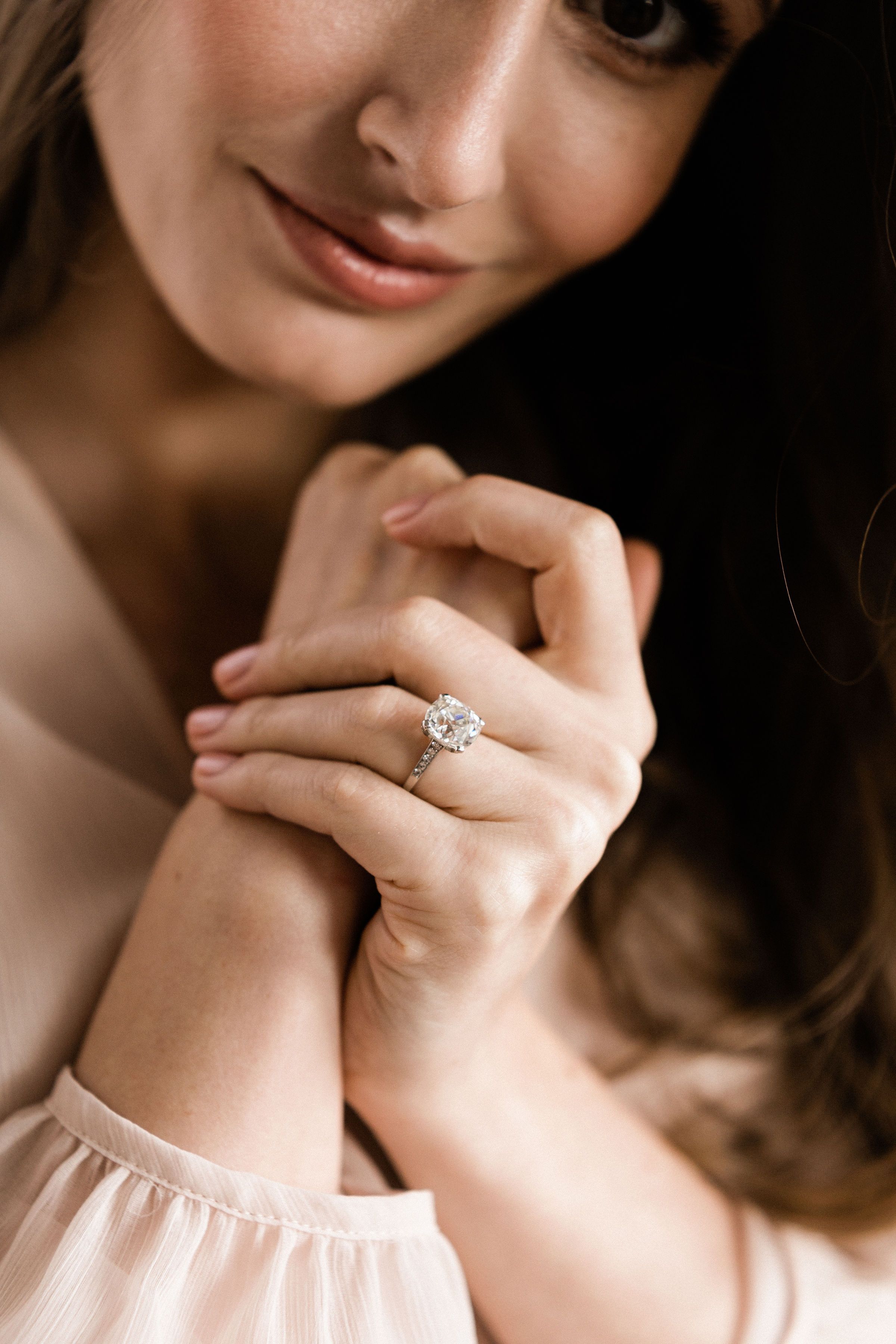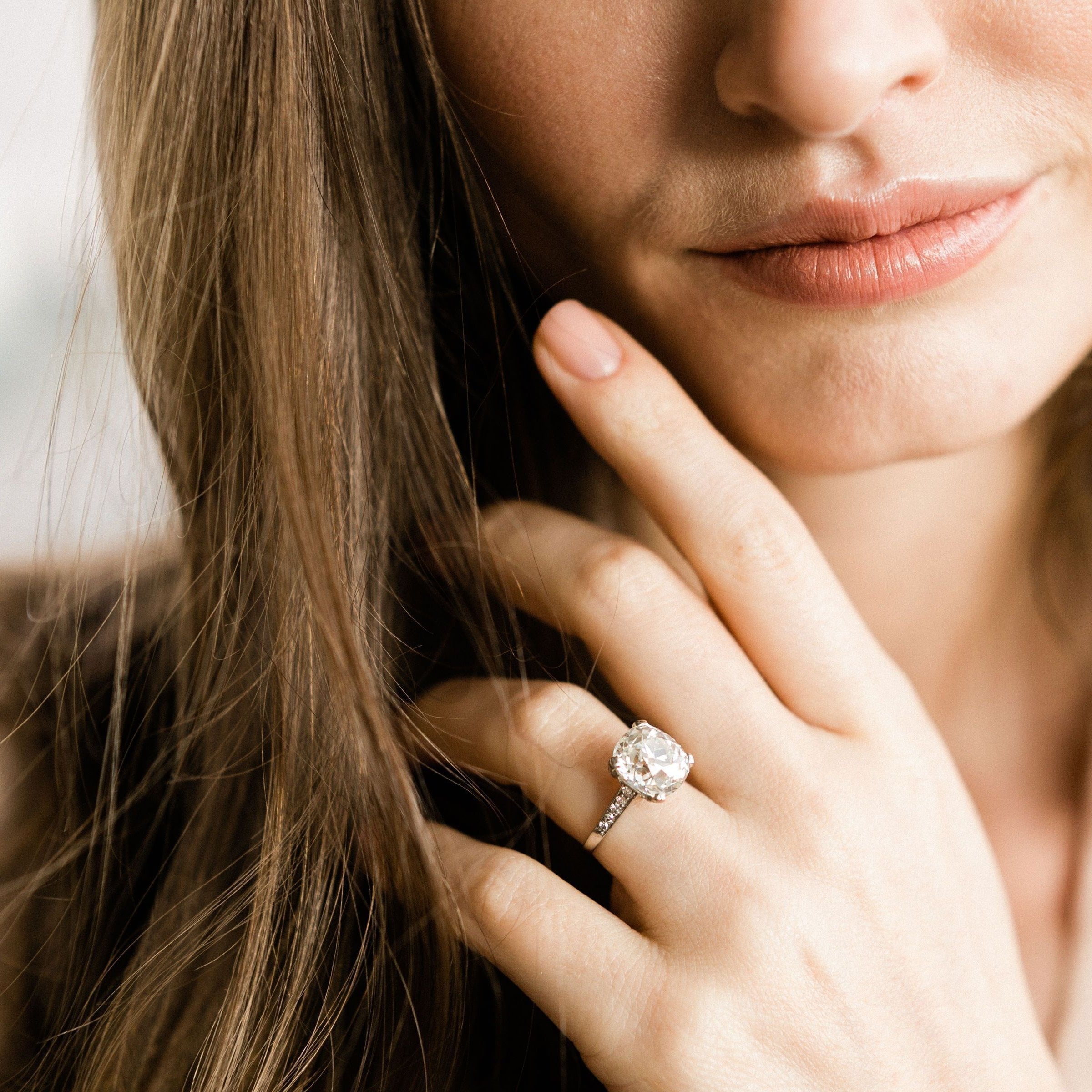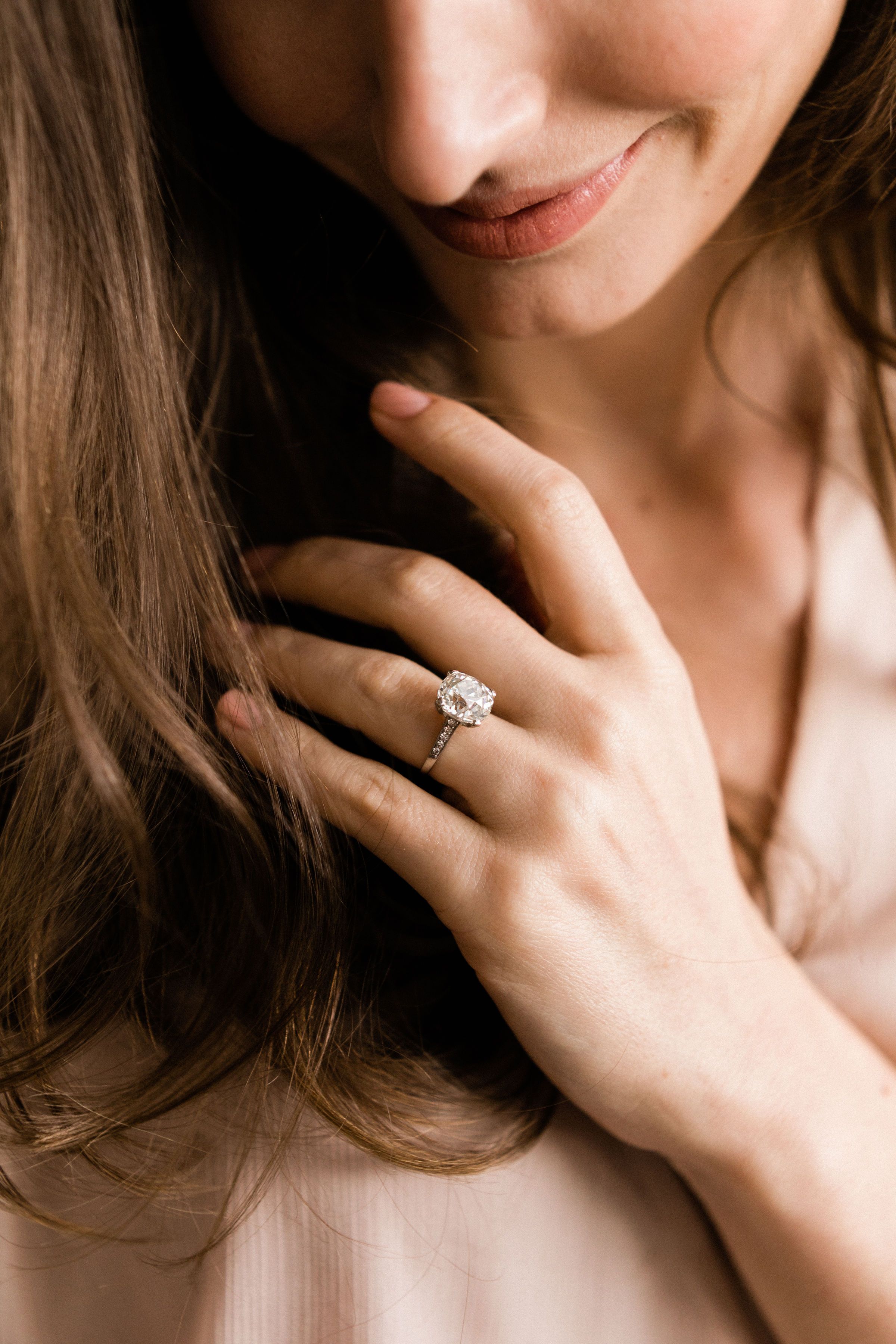 Seriously impossible not to fall in love with this beauty! This is the cut of antique diamond that I search high and low for with the perfect chunky faceting and a super white facing color! The setting is simple with an extra bit of glimmer in the diamonds to enhance but not detract from this dream diamond!