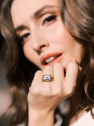 The Ellis ring is a vintage-inspired VB-made diamond engagement ring. The ring centers a GIA certified 5.16-carat Rectangular Step cut diamond of M color, VS1 clarity. The stone is set in a 4-prong 18kt yellow gold setting. The ring is currently size 6 and can be resized!