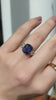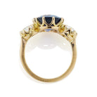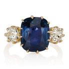 We love the vibrancy of all of the colors in this ring. The blue-violet of the sapphire contrasts against the yellow gold and the shimmer of the antique diamonds brings in a rainbow of fire.