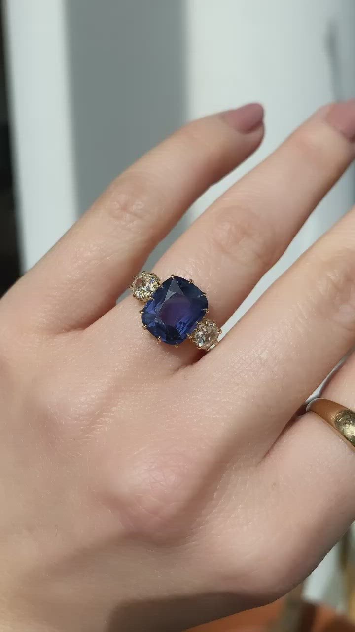 The Mallory 5.17 ring is a vintage-inspired VB-made diamond engagement ring. The ring centers a Lotus certified 5.17-carat old mine cut no heat Burmese sapphire. The stone is set in an 18-karat yellow gold setting. To each side of the sapphire is an old mine cut diamond. The side stones combine for a total of 0.86 carats. The ring is currently size 5.25 and can be resized!