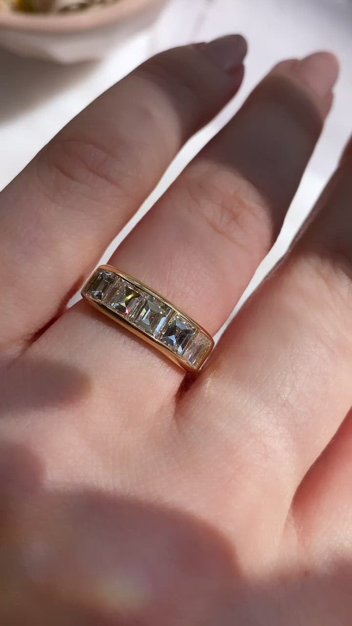 The Duchess 2.00 ring is a VB original design made right here in NYC. The ring features 5 Carré cut diamonds of approximately G-H color, VS clarity that combine for 2.00 carats. The stones are channel-set in an 18 karat yellow gold setting. The ring is currently size 5.5 and can be resized!