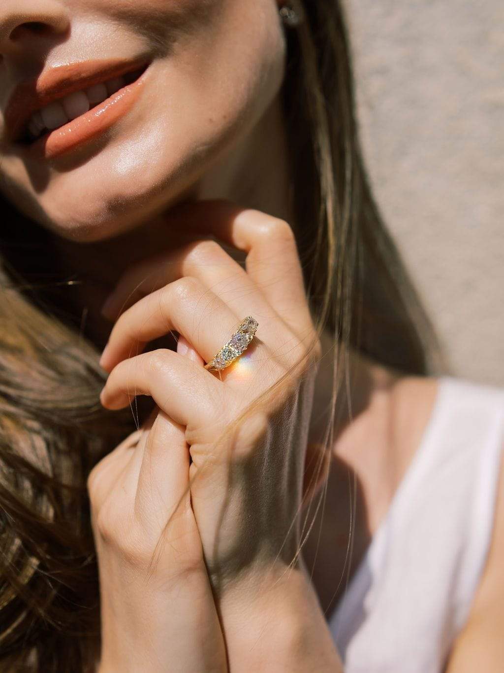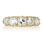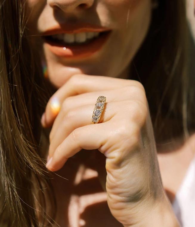 The Vince ring is a newly made ring featuring 5 authentically antique diamonds. The ring features five chunky, gorgeous old mine cut diamonds of approximately J-K color, VS clarity. The five diamonds combine for approximately 2.25 carats. The ring is currently size 7 and can be resized!