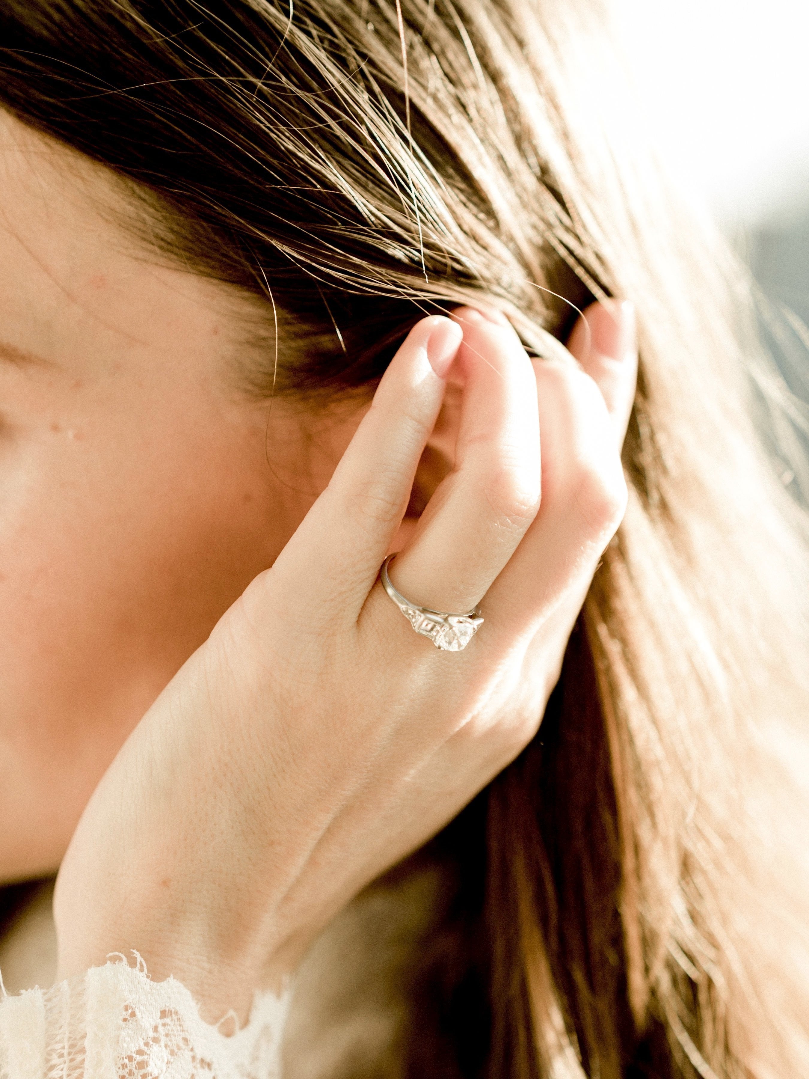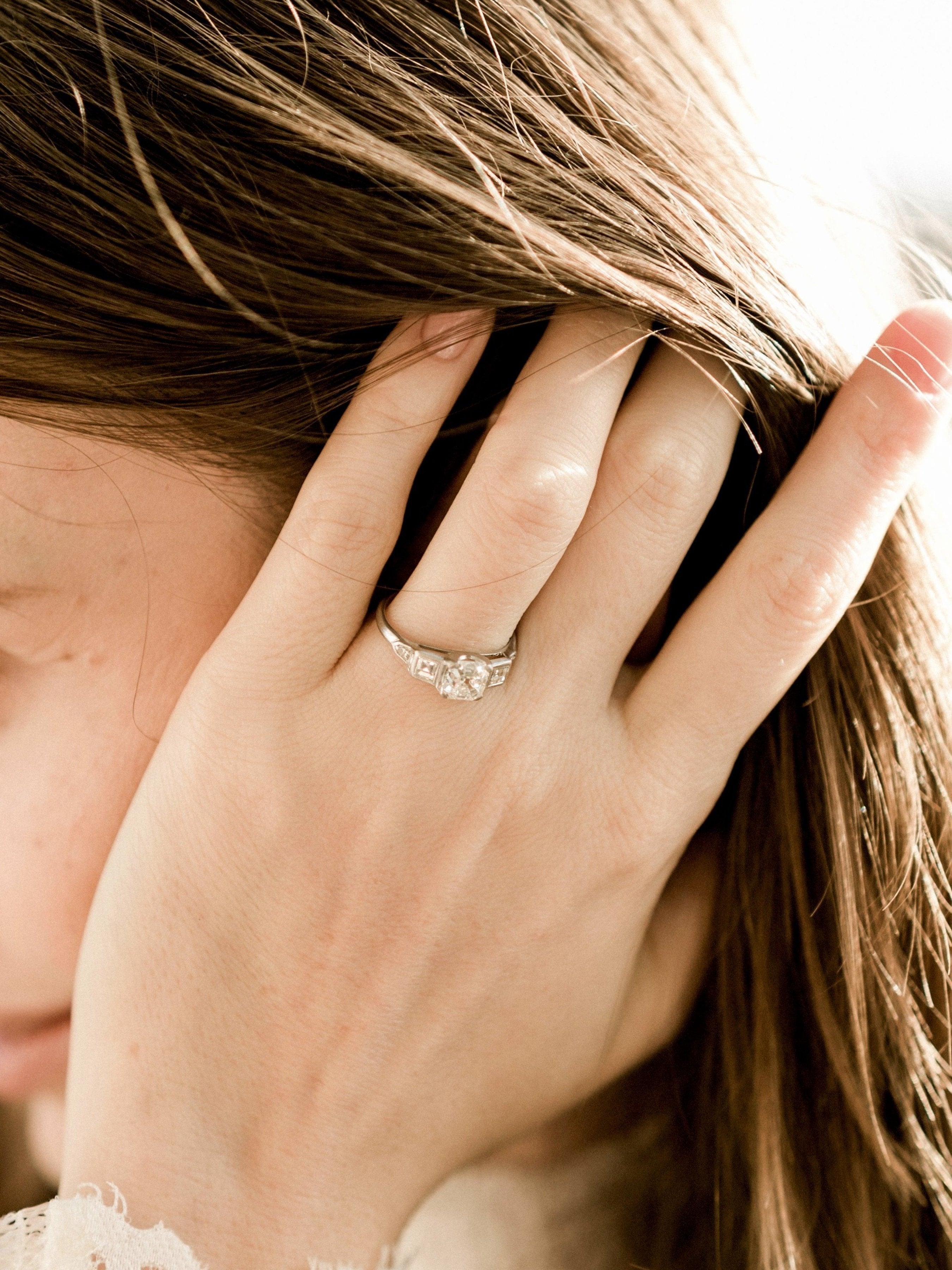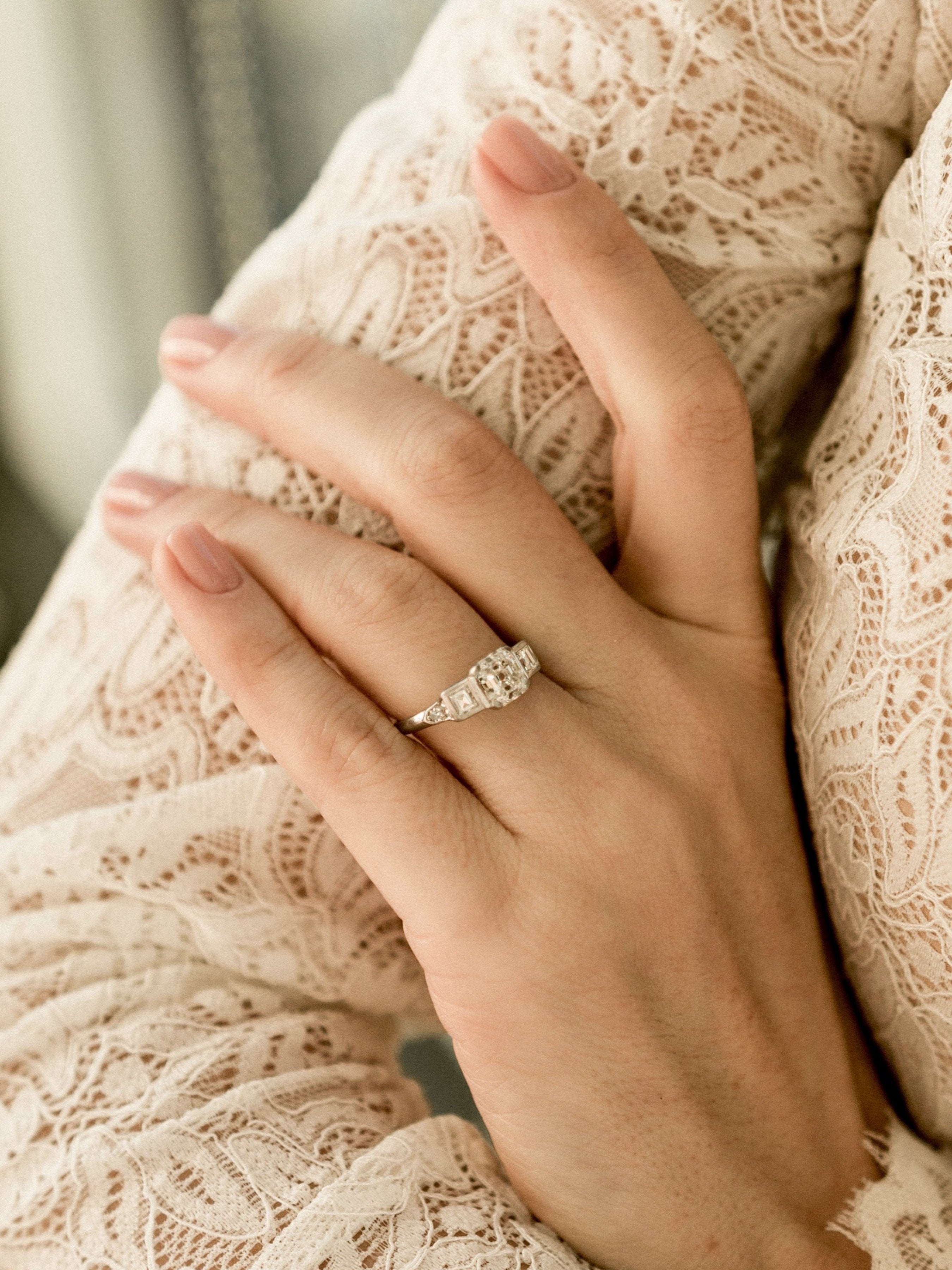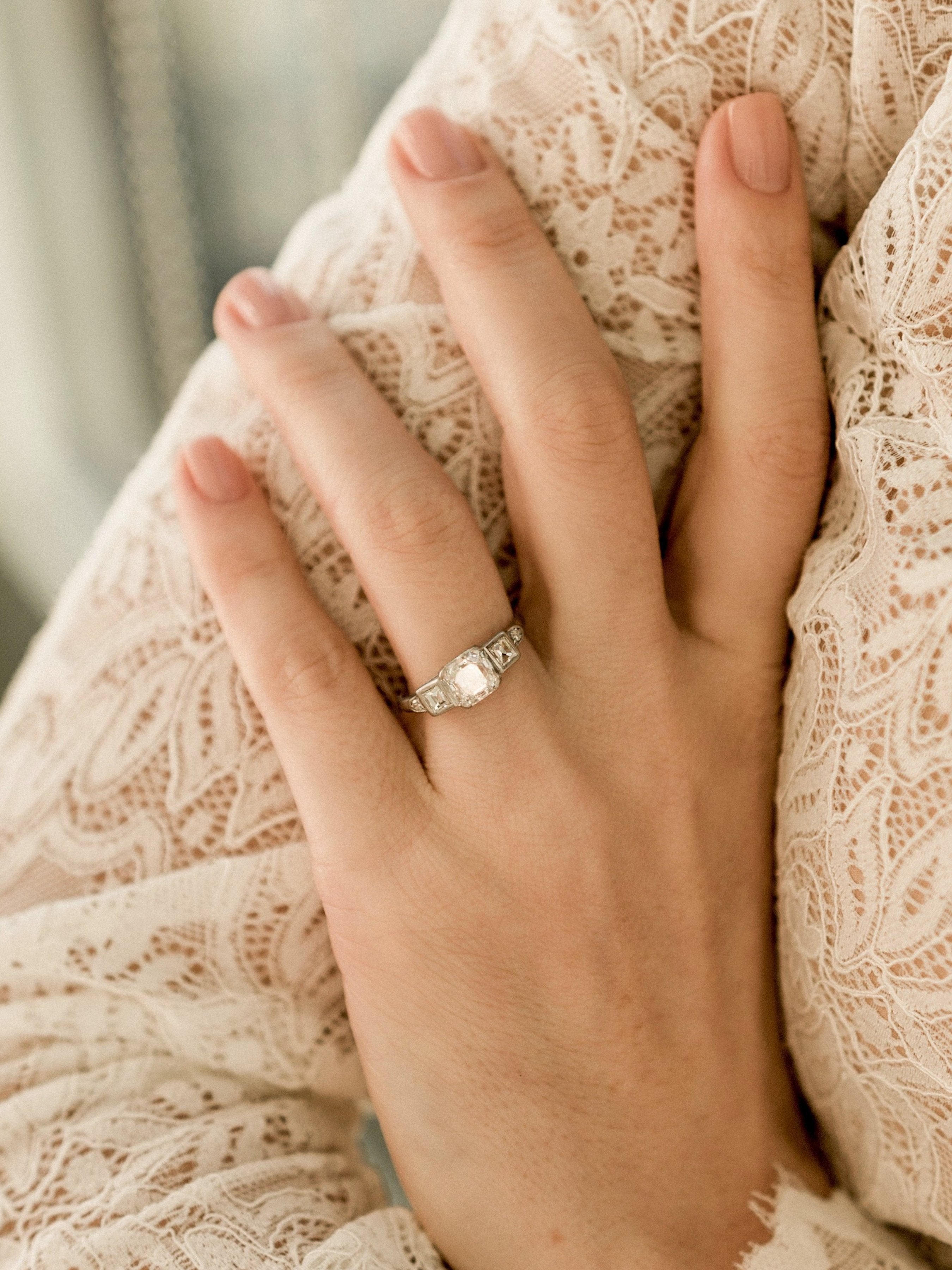 The Sonora Ring is an authentic Art Deco ring circa 1925! This Asscher cut engagement ring centers a GIA certified 1.45ct Asscher cut diamond of I color, VS2 clarity. The diamond is set in a 4-prong platinum setting with a carré cut diamond bezel-set into each shoulder with two round diamonds following those. The ring is size 6.25 and can be resized.