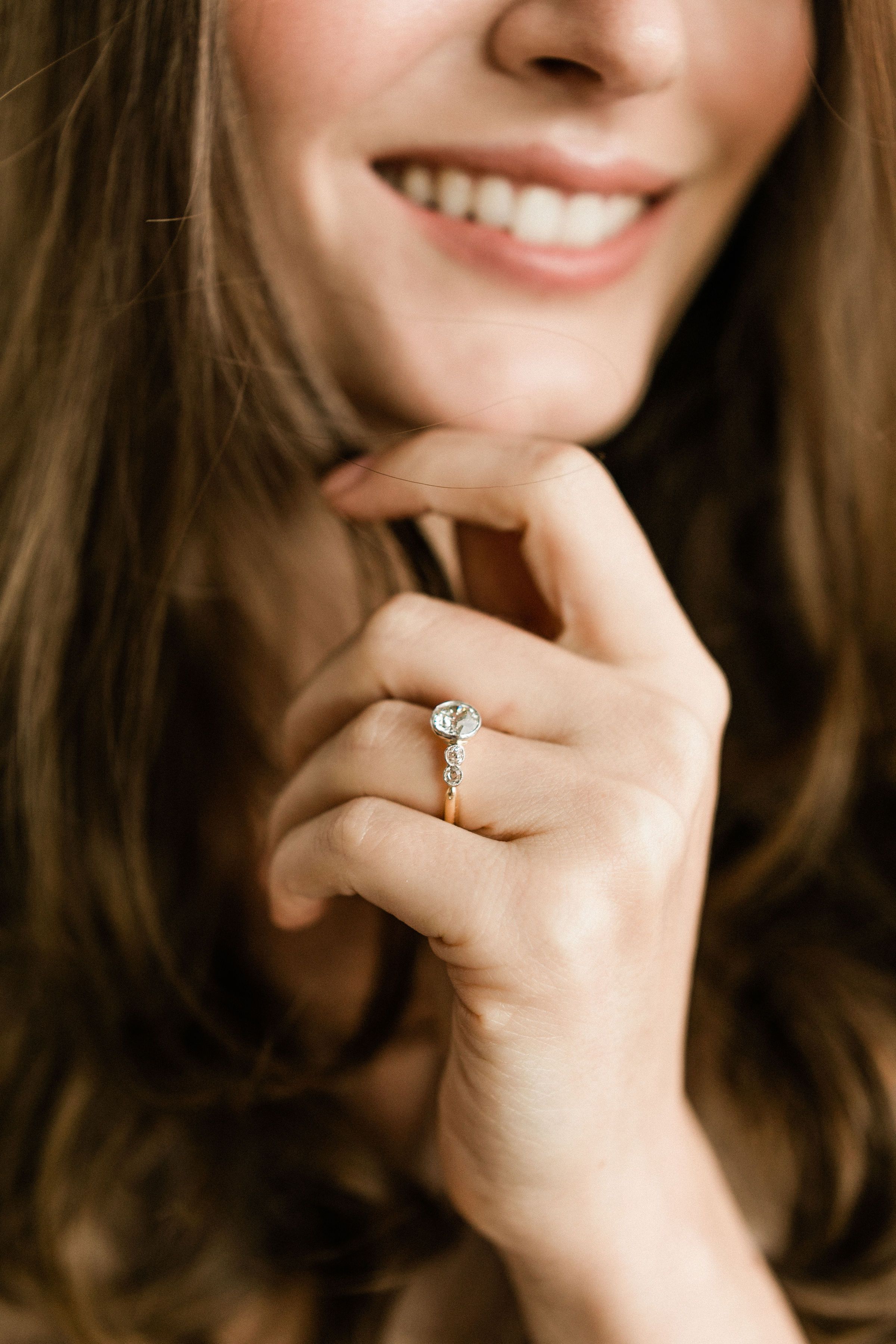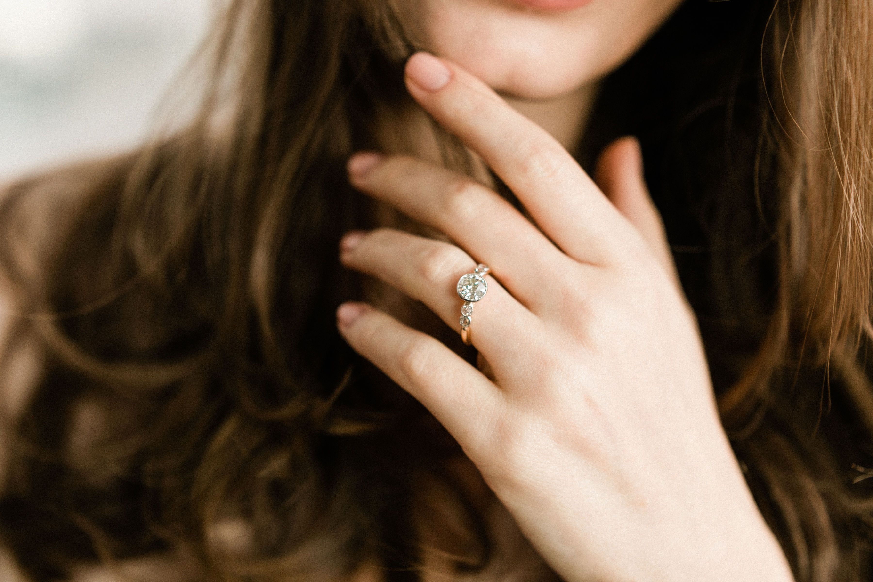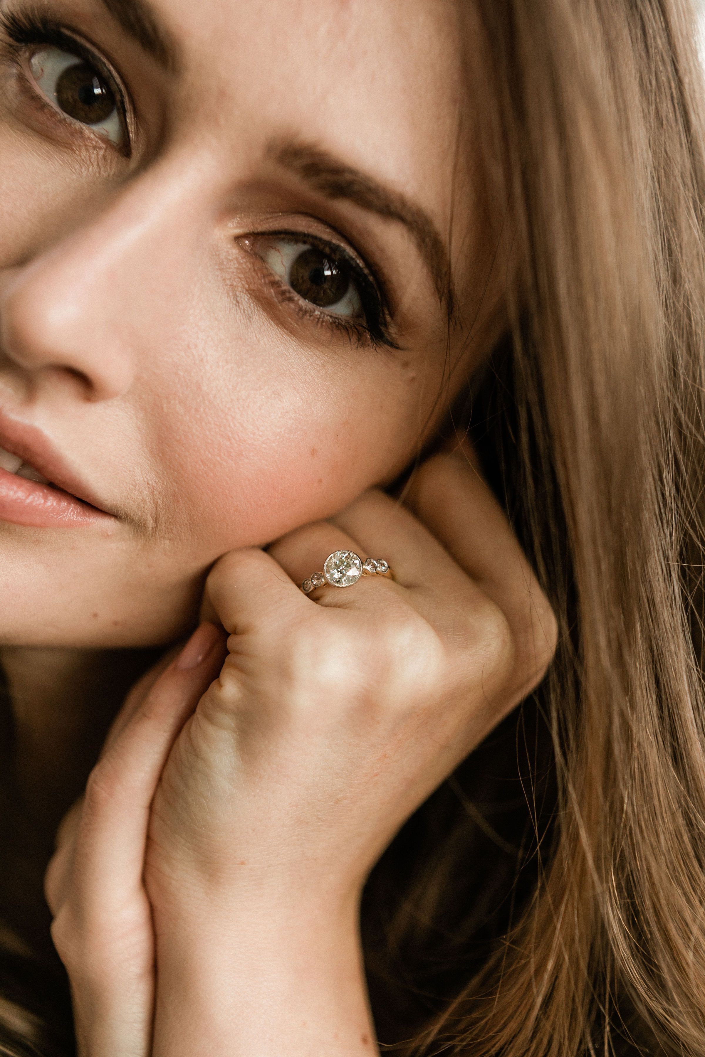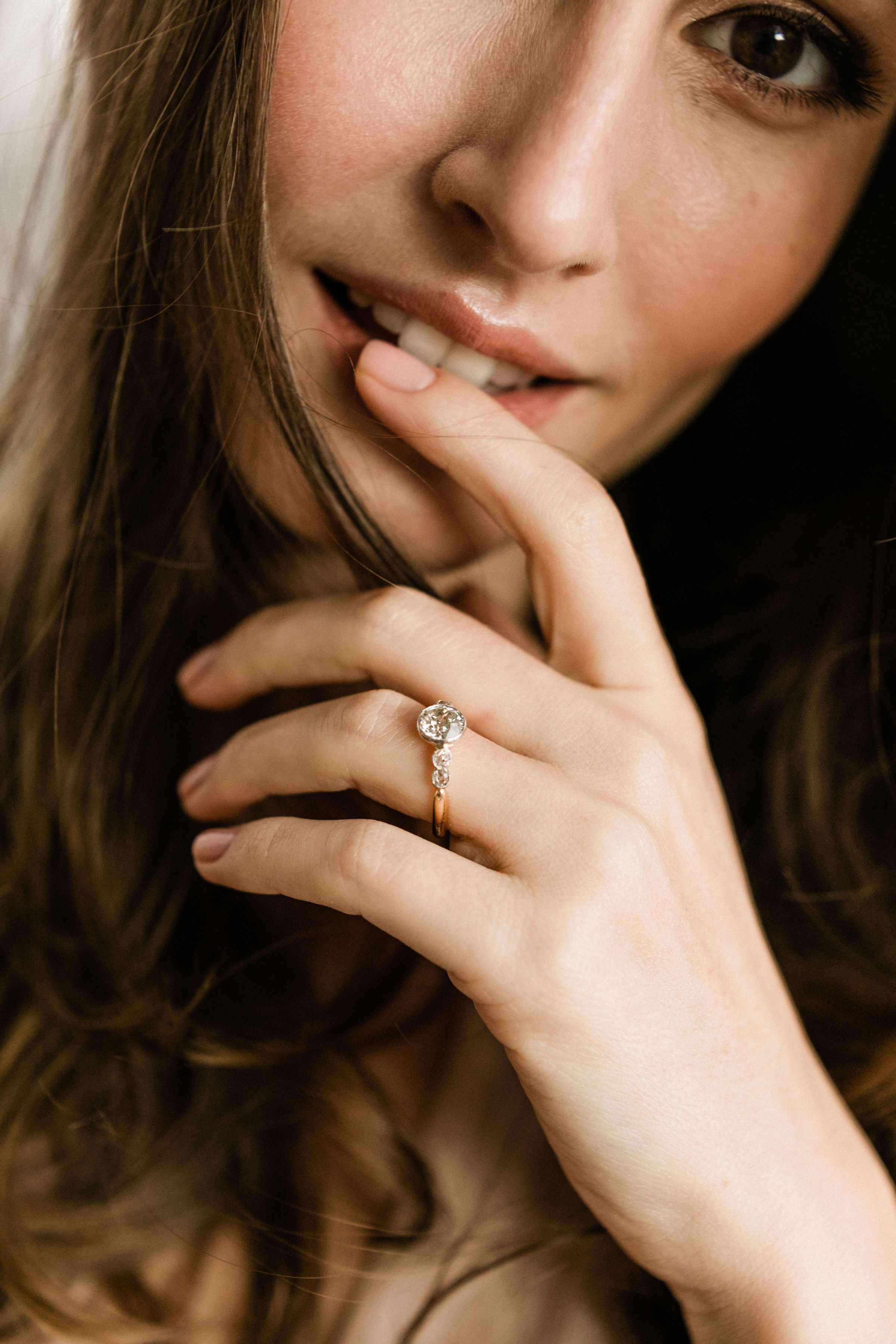 The Ambre Ring is an authentic Vintage Edwardian Era Engagement Ring circa 1910! This 5 stone bezel set diamond engagement ring centers a GIA Certified 1.40 carat old European cut diamond of M color, SI1 clarity. The diamond is bezel-set in a platinum topped yellow gold setting with two small bezel set diamonds so each side which combine for approximately 0.16 carats. The ring is size 8 and can be resized!