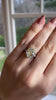 The center stone is the old mine cut diamond of our dreams! A slightly oval shape with those big, broad facets that we love so much. We set it classically with sleek baguette side stones and crisp corner prongs.