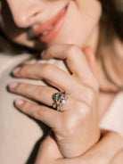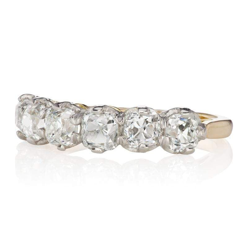 The Felicia 1.91 ring is a VB-made 6 diamond two tone engagement ring. The ring has 6 old mine cut diamonds of approximately J-K color, VS clarity. The diamonds combine for 1.91 carats. The stones are set in a platinum basket and an 18-karat yellow gold band. The ring is currently size 6 and can be resized!