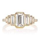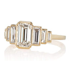The Berry 1.25 ring is a VB original design made right here in NYC. The ring centers a GIA certified 1.25-carat Emerald cut diamond of J color, VS1 clarity. To each side are three baguettes descending in size, all six combining for approximately 1.20 carats. The stones are set in an 18 karat yellow gold setting. The ring is currently size 6 and can be resized!
