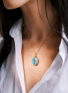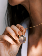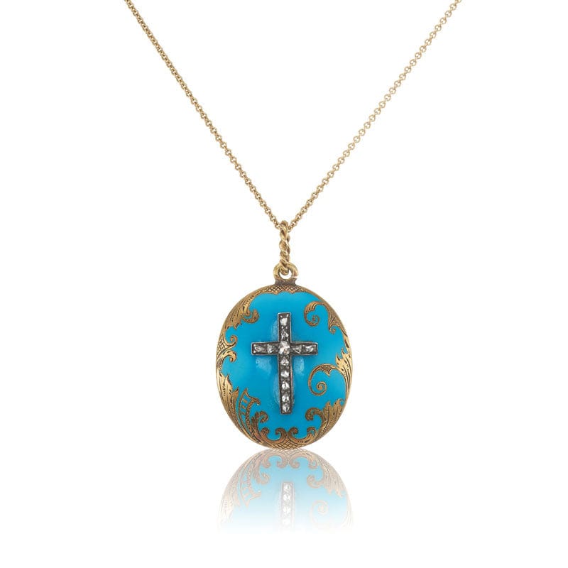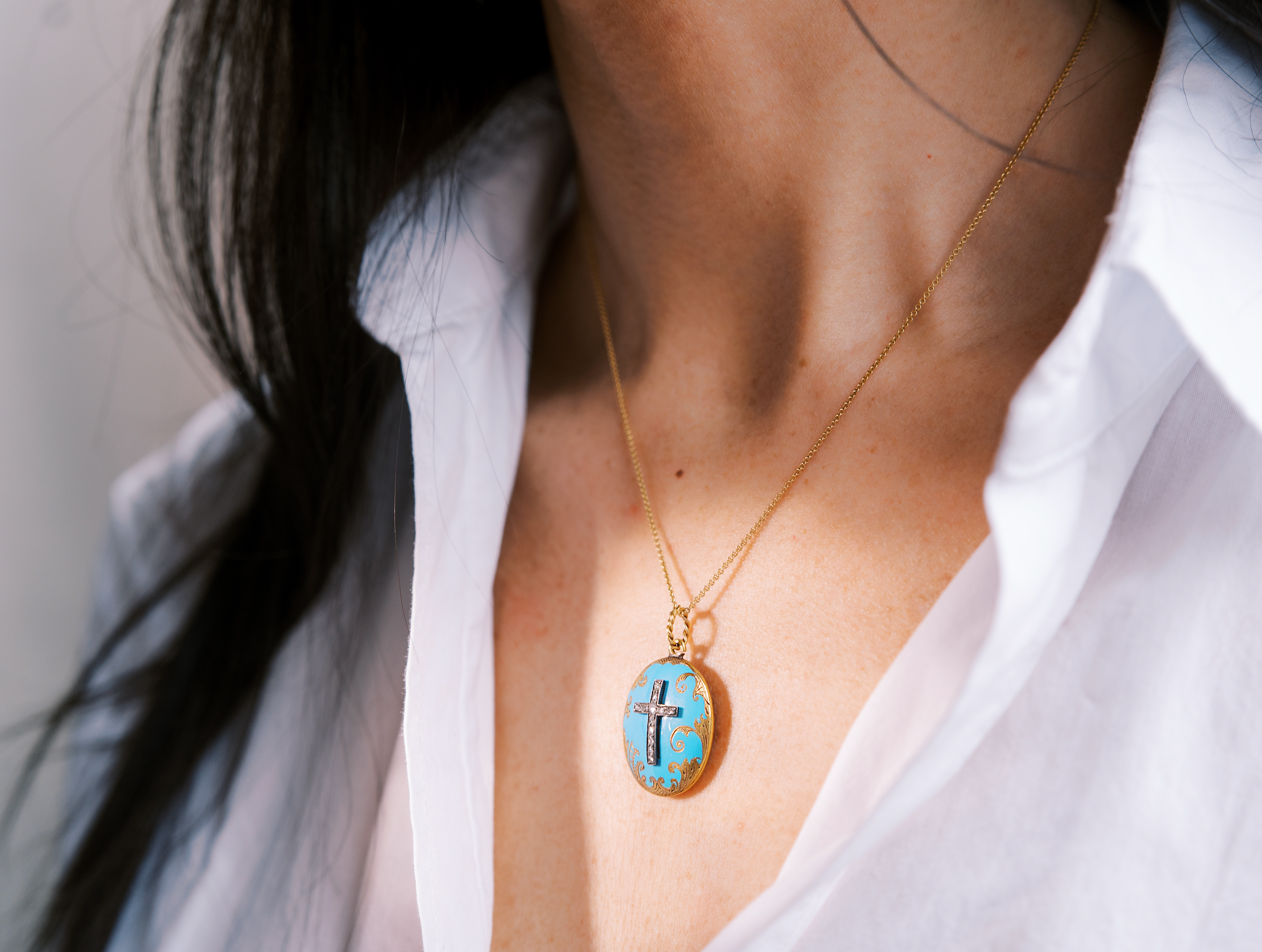 The Abbott necklace is from the Victorian Era circa 1860. It features enamel and a rose cut diamond cross on the front and a painting of a gentleman on the back. The cross is made up of 12 rose cut diamonds set in a platinum on an 18kt yellow gold pendant.