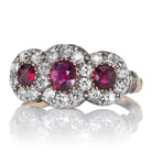 This three-stone beauty features three deep rubies surrounded by a halo of chunky antique stones. She is low set with tons of antique diamond shine for a wearable piece with a lot of impact. A charming piece of history.