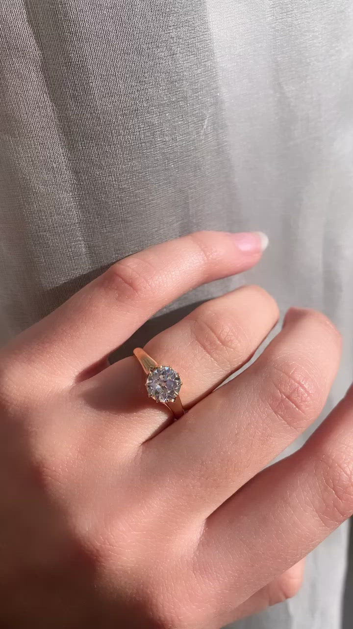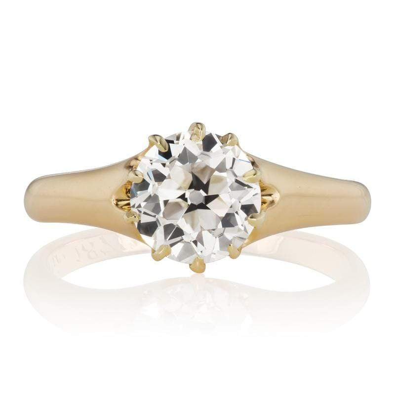 The Addie ring is an authentic antique engagement ring circa 1872! The ring centers a GIA certified 1.52-carat old European cut diamond of I color, VVS2 clarity. The stone is set in a 10-prong 14 karat yellow gold setting. The inside of the ring has an original hand engraving that reads "David to Addie 1872". The ring is currently size 5.5 and can be resized!
