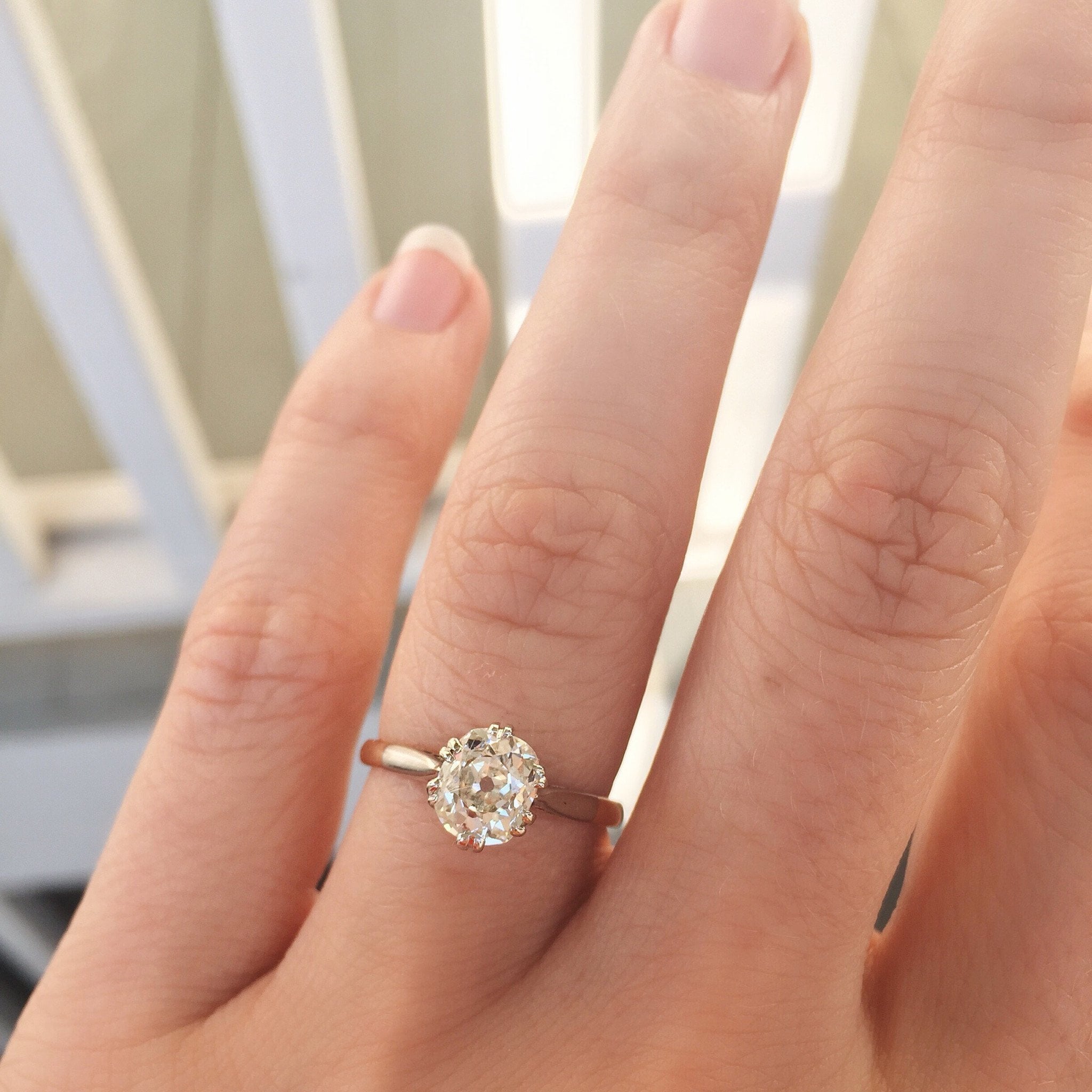 The diamond really makes this ring! It is a beautiful old mine cut diamond with everything that you want from an old cut stone! It has blocky patterns of light, gives off the best pastel flashes of color, and has the perfect size culet! The prongs are subtle to let the diamond sparkle more! This hand-cut diamond is truly one-of-a-kind!