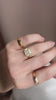 A sleek piece with a gorgeously sunny Emerald cut set in a golden ring. The hidden halo adds a subtle touch and keeps with the linear themes of the center stone.