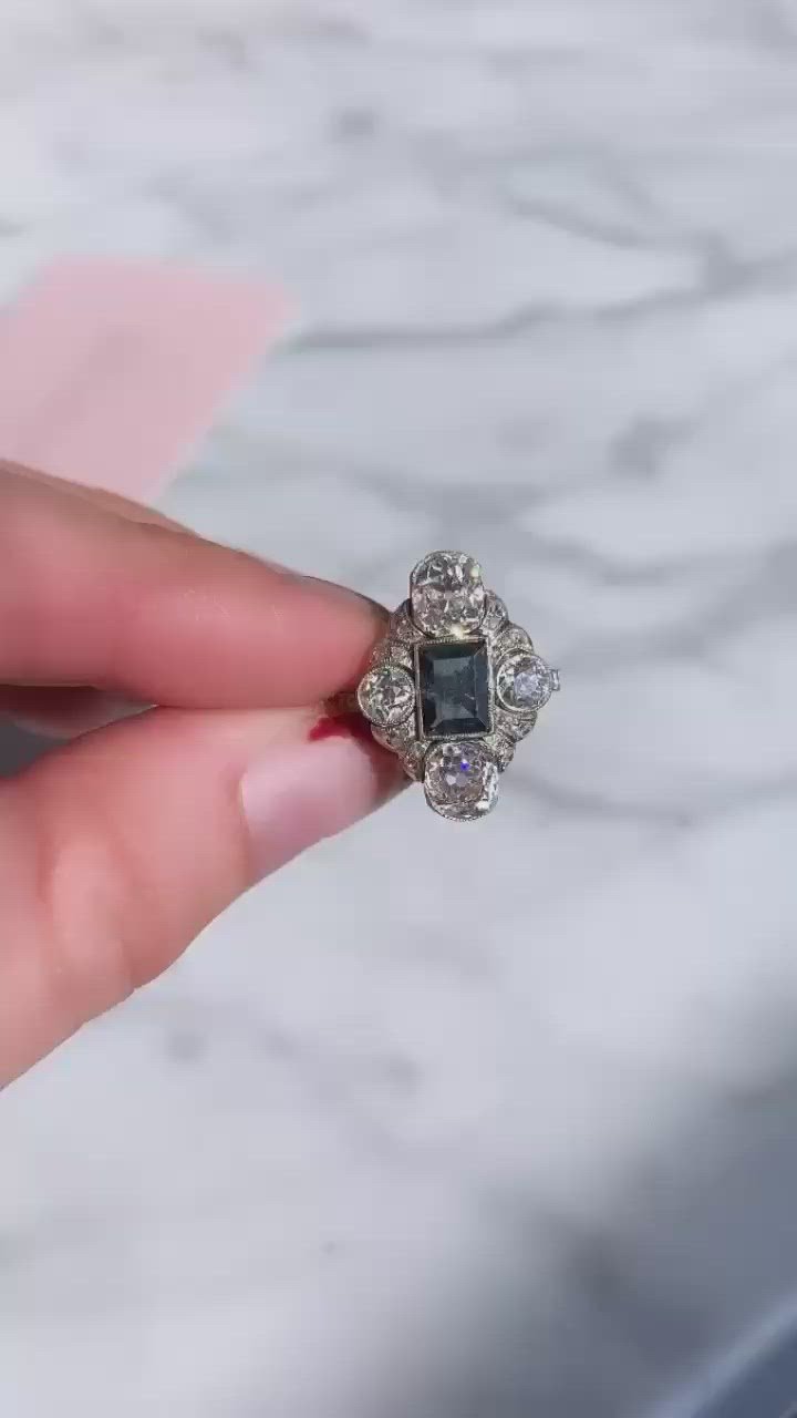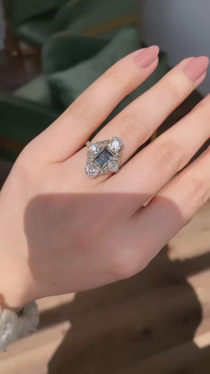 A seriously stunning, very Edwardian piece that is unlike most we've ever seen! The color-changing Alexandrite is such a beautiful center stone with a dark blue-green in certain lighting and flashes of red-purple in others! The diamonds are gorgeous and chunky with so much liveliness! The whole piece is exquisitely made, low profile, and a fun shape!