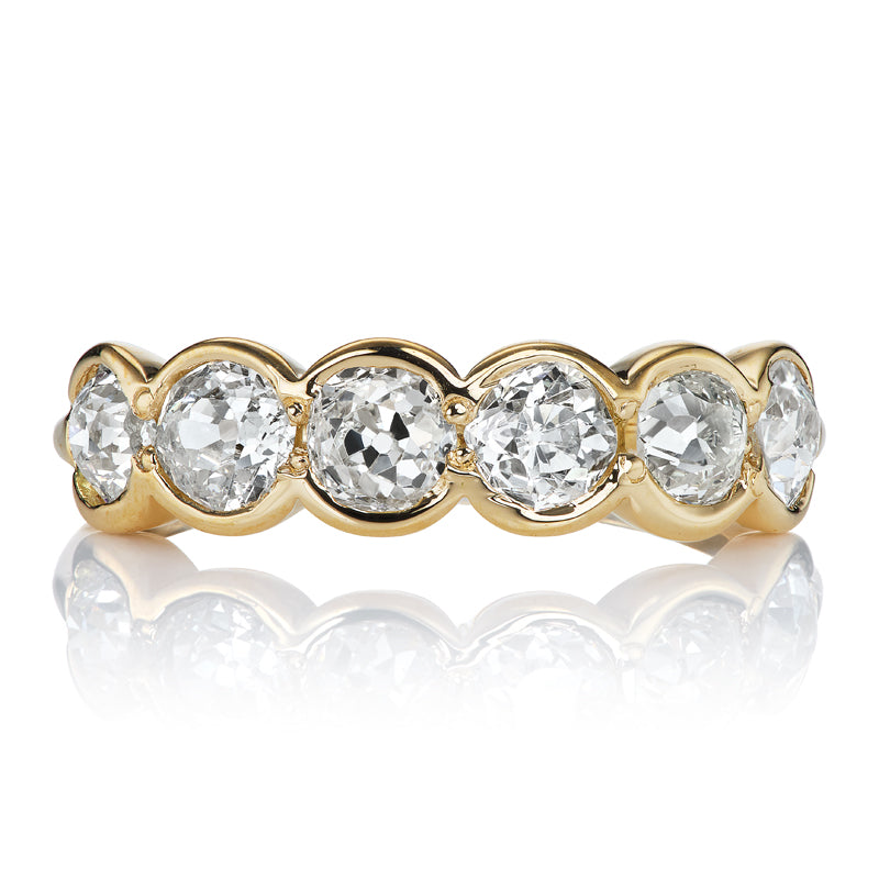 The Allure 1.74 band is an AB original design made right here in NYC! This ring features 6 old mine cut diamonds that combine for 1.74 carats that are half bezel-set in our signature 18kt yellow gold setting. The diamonds are approximately J-K in color, VS-SI in clarity. The ring is currently size 5.75 and can be resized!