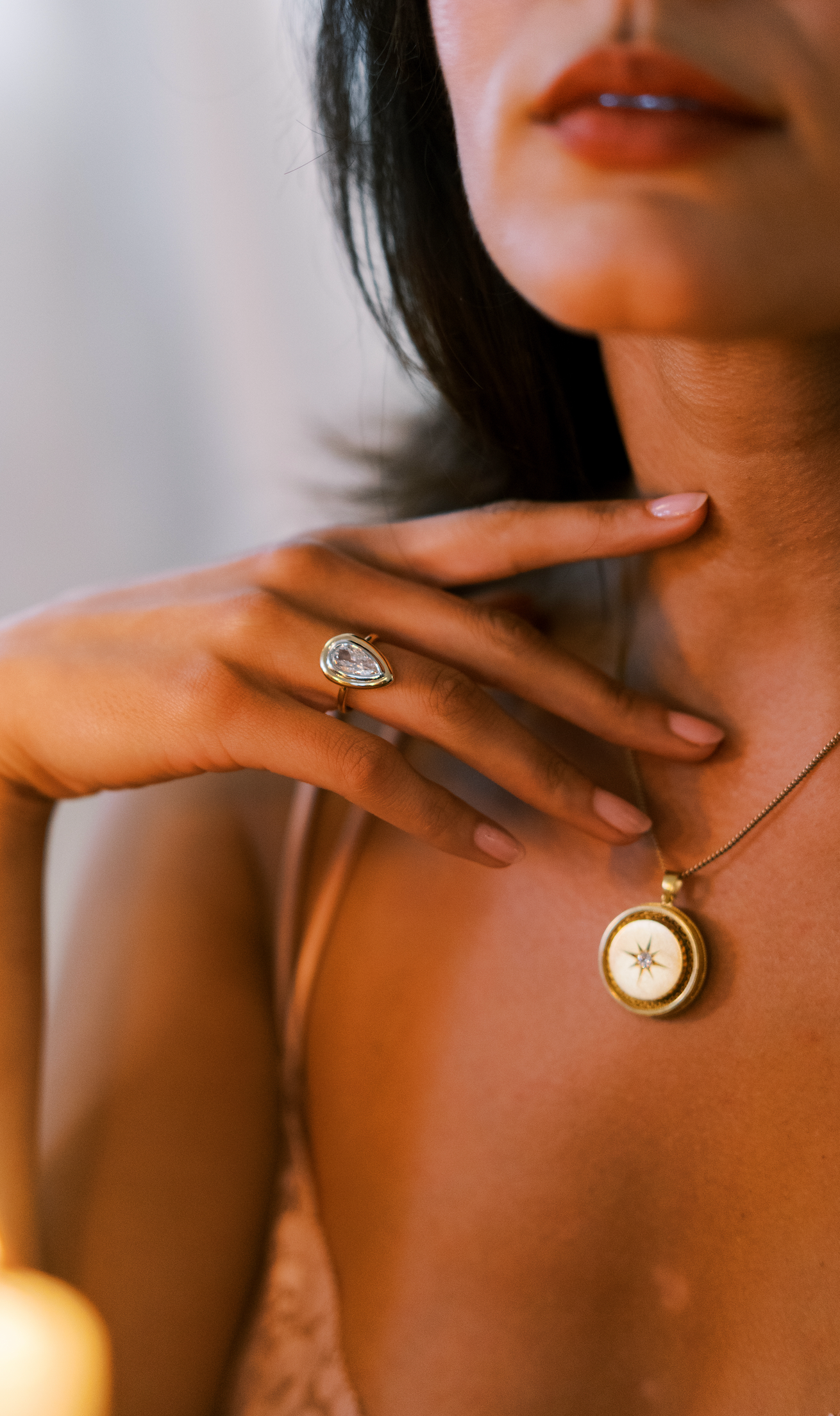 The Amalfi 1.42 ring is an AB original design made right here in NYC. The ring centers a GIA-certified 1.42 carat Pear Brilliant Cut diamond of J color, VS2 clarity. The stone is set in a two-tone setting of platinum and our signature 18kt yellow gold. The ring is currently size 6 and can be resized!