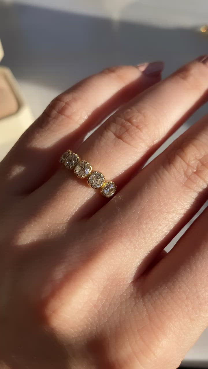 The Andria 1.26 ring is a VB original made right here in NYC. The ring features 5 old mine cut diamonds of approximately J-K color, VS-SI clarity. The diamonds combine for 1.26 carats and each collet-set in an 18 karat yellow gold ring. The ring is currently size 6.5 and can be resized!