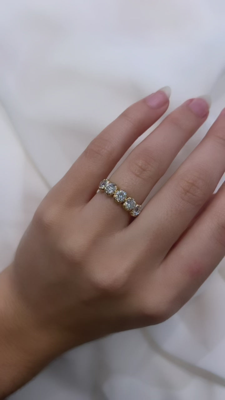 The Andria Band 2.18 is an AB original design made right here in NYC. The ring features 5 Old Mine Cut diamonds of approximately J-K color, VS-SI clarity. The diamonds combine for 2.18 carats and are collet-set in our signature 18 karat yellow gold setting. The ring is currently size 6.25 and can be resized!