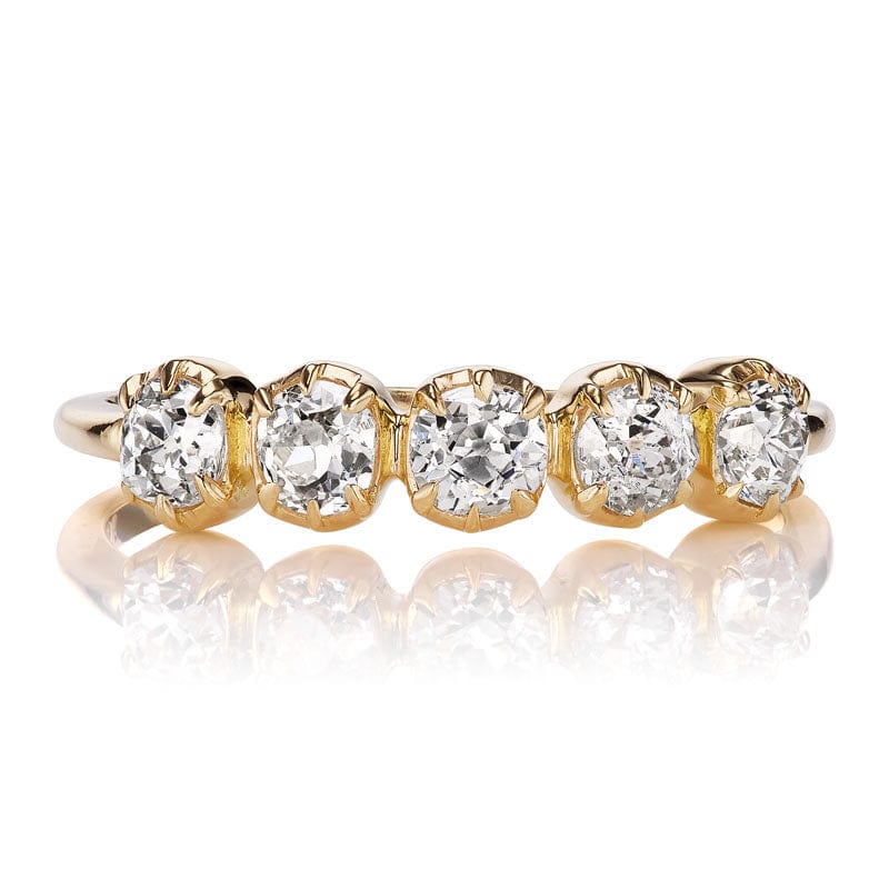 The Andria Band 0.83 is a VB original design made right here in NYC. The ring features 5 old mine cut diamonds of approximately I-J color, VS-SI clarity. The diamonds combine for 0.83 carats and are collet-set in an 18 karat yellow gold setting. The ring is currently size 6.5 and can be resized!