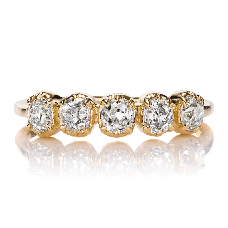 The Andria Band 0.87 is a VB original design made right here in NYC. The ring features 5 old mine cut diamonds of approximately J-K color, VS-SI clarity. The diamonds combine for 0.87 carats and are collet-set in an 18 karat yellow gold setting. The ring is currently size 6.5 and can be resized!