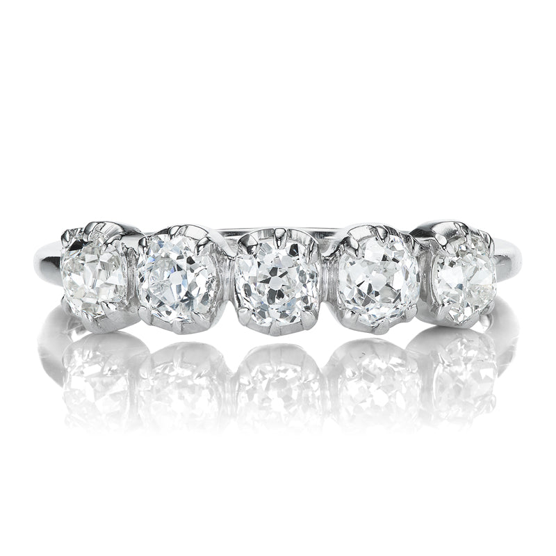 The Andria Band 0.99 is an AB original design made right here in NYC. The ring features five Old Mine cut diamonds of approximately I-J color, VS-SI clarity. The diamonds combine for 0.99 carats and are collet-set in a platinum setting. The ring is currently size 6 and can be resized!