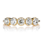 The Andria Band 1.05 is a VB original design made right here in NYC. The ring features 5 old mine cut diamonds of approximately J-K color, VS-SI clarity. The diamonds combine for 1.05 carats and are collet-set in an 18 karat yellow gold setting. The ring is currently size 6.5 and can be resized!