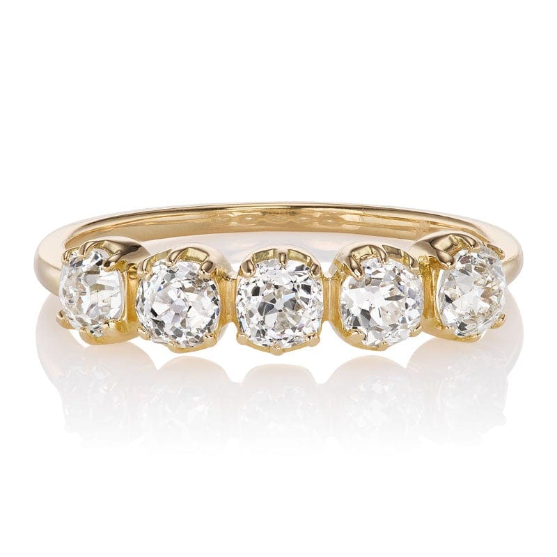 The Andria 1.12 ring is a VB original design made right here in NYC. The ring features 5 old mine cut diamonds of approximately J-K color, VS-SI clarity. The diamonds combine for 1.12 carats and are each collet-set in an 18 karat yellow gold ring. The ring is currently size 6.25 and can be resized!