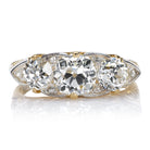 The Francis ring is an authentic antique ring from the Victorian Era circa 1880. The ring centers an Old Mine Cut diamond of approximately 1.20 carats with an Old Mine Cut diamond set to each side, both combining for approximately 1.10 carats of approximately K-L color, VS-SI clarity. The stone is set in a beautifully engraved two-tone platinum and 18kt Yellow Gold setting with 6 rose cut diamonds embellished around the three main diamonds. The ring is currently size 6 and can be resized!
