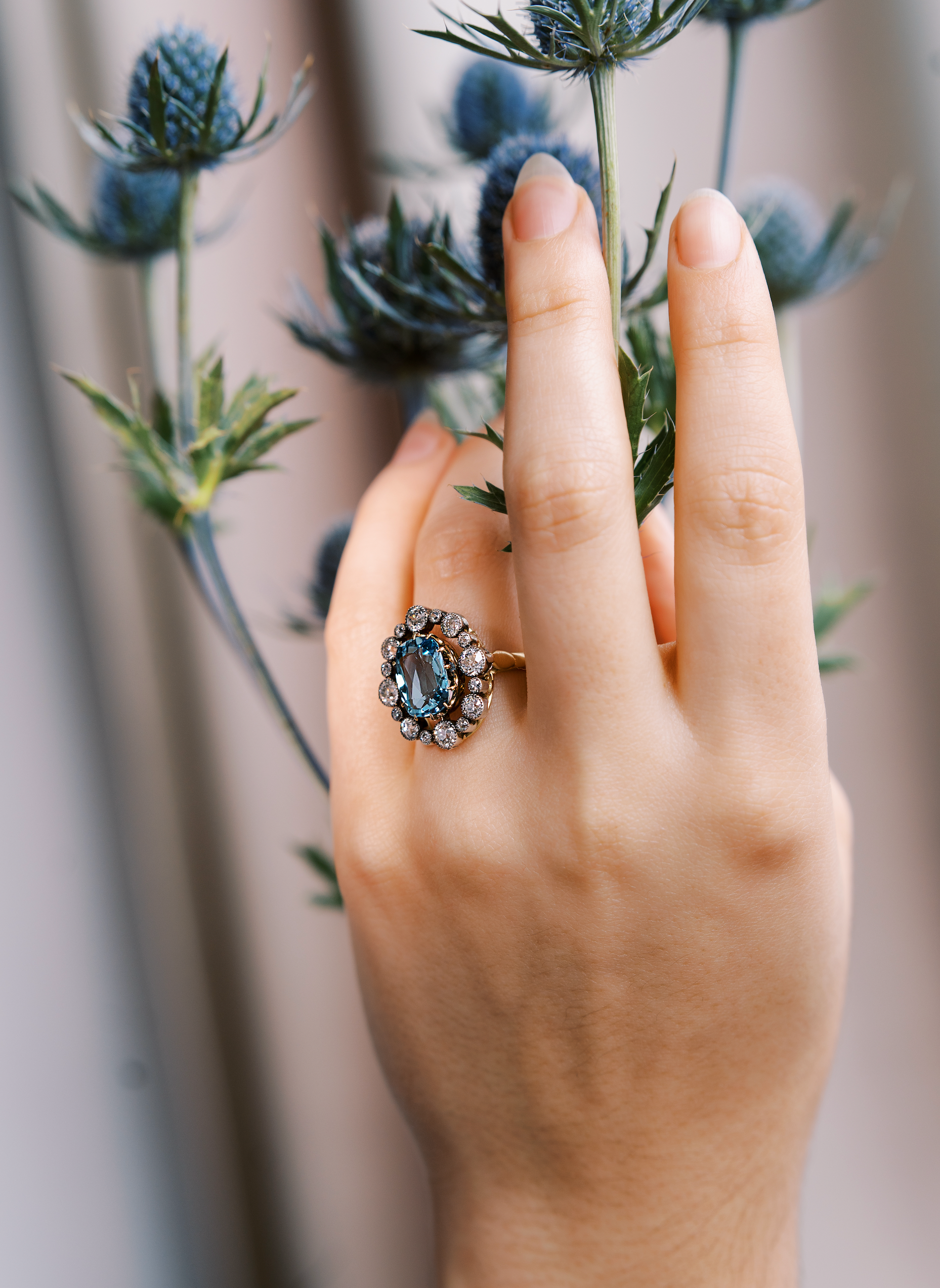The Imogen ring is an authentic antique brooch that was converted into a ring recently. This aquamarine and diamond cluster ring is from the Edwardian Era circa 1900. The ring centers a GIA-certified cushion cut aquamarine weighing approximately 3.50-carats. A halo of 16 bezel set old European cut diamonds of approximately I-J color, VS-SI clarity combining for roughly 2.20-carats surrounds the center stone. The stone is set in a 12-prong 18kt yellow gold and silver setting. The ring is currently size 6.5 and can be resized!