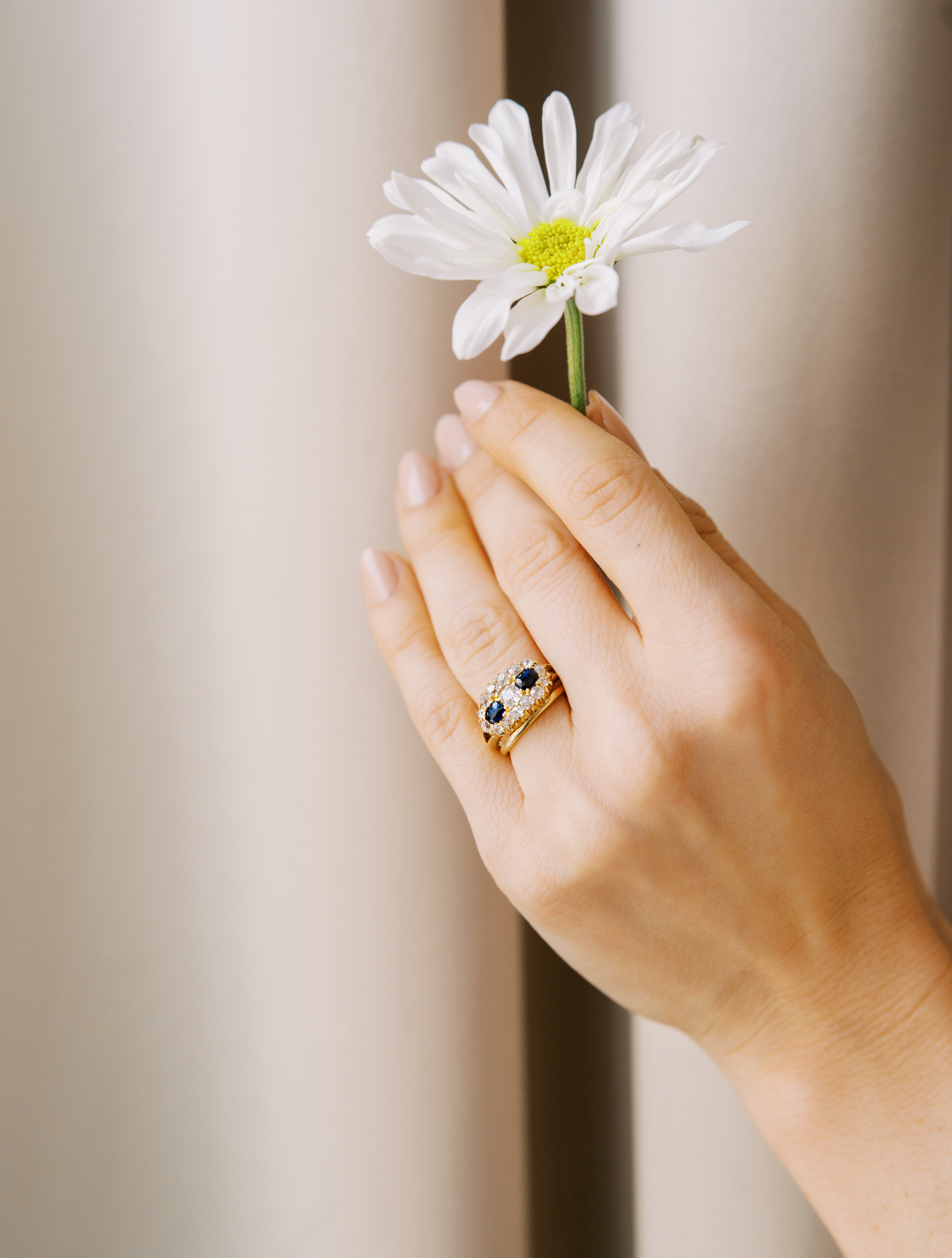 A stunning antique piece low set to the finger with a beautiful span. Lively antique stones create a glittery show to this one-of-a-kind find.