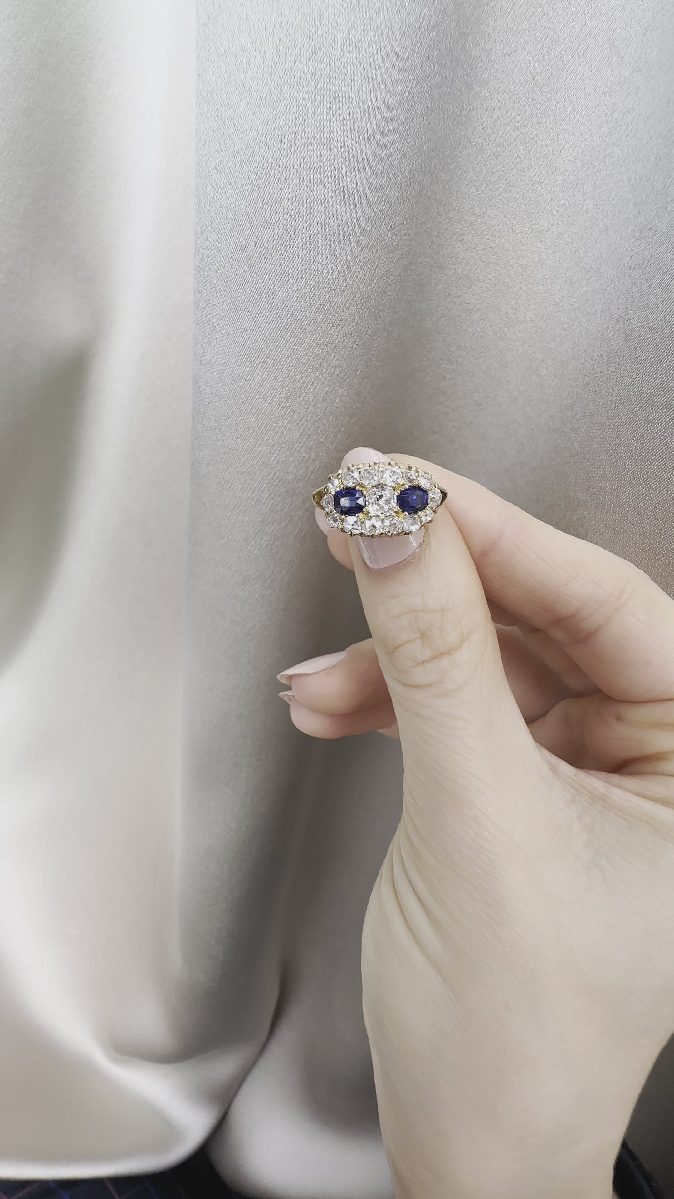 The Anya ring is an authentic antique diamond and sapphire ring from the Victorian Era circa 1867. The ring centers an Old Mine Cut diamond of approximately 0.25-carats with a sapphire on either side combining for approximately 0.40-carats. The stones are surrounded by fourteen smaller old mine cut diamonds combining for approximately 0.70-carats. The diamonds are all approximately L-M-N color, VS-I1 clarity. The stones are set in a 14kt yellow gold split shank setting stamped with hallmarks that appear to date this ring to 1867! The ring is currently size 6 and can be resized!
