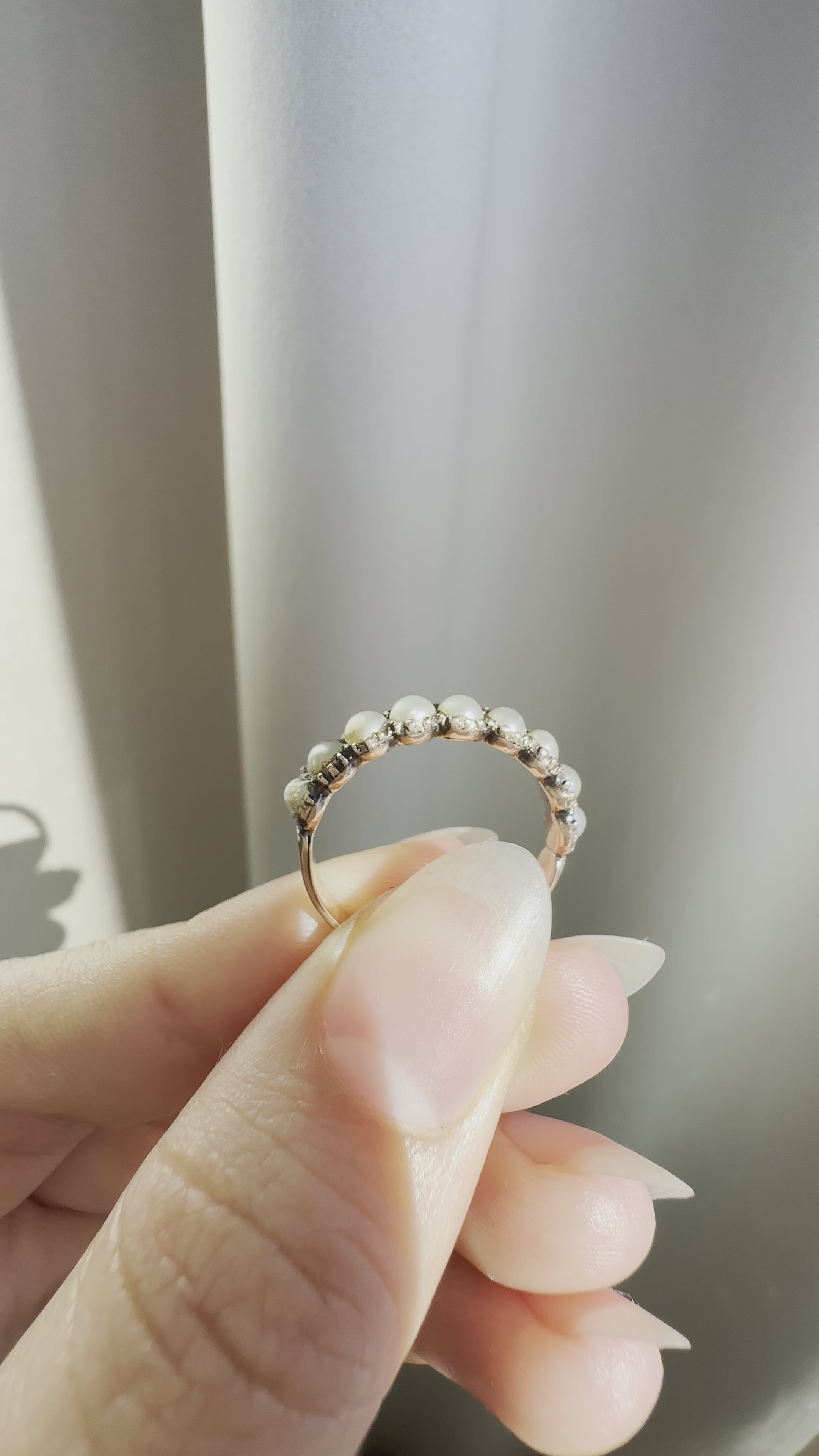 This delicate pearl band sits nice and close to the finger, and would look lovely stacked or solo.