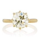 The Bella 2.77 ring is a VB made engagement ring with an authentically antique diamond! This Antique Cushion Cut Diamond Engagement Ring centers a GIA Certified 2.77 carat old mine cut diamond of O-P color, SI1 clarity. The diamond is set in a crisp 8-prong 18kt yellow gold setting with a shank that delicately tapers toward the diamond. The ring is currently size 5.75 and can be resized!