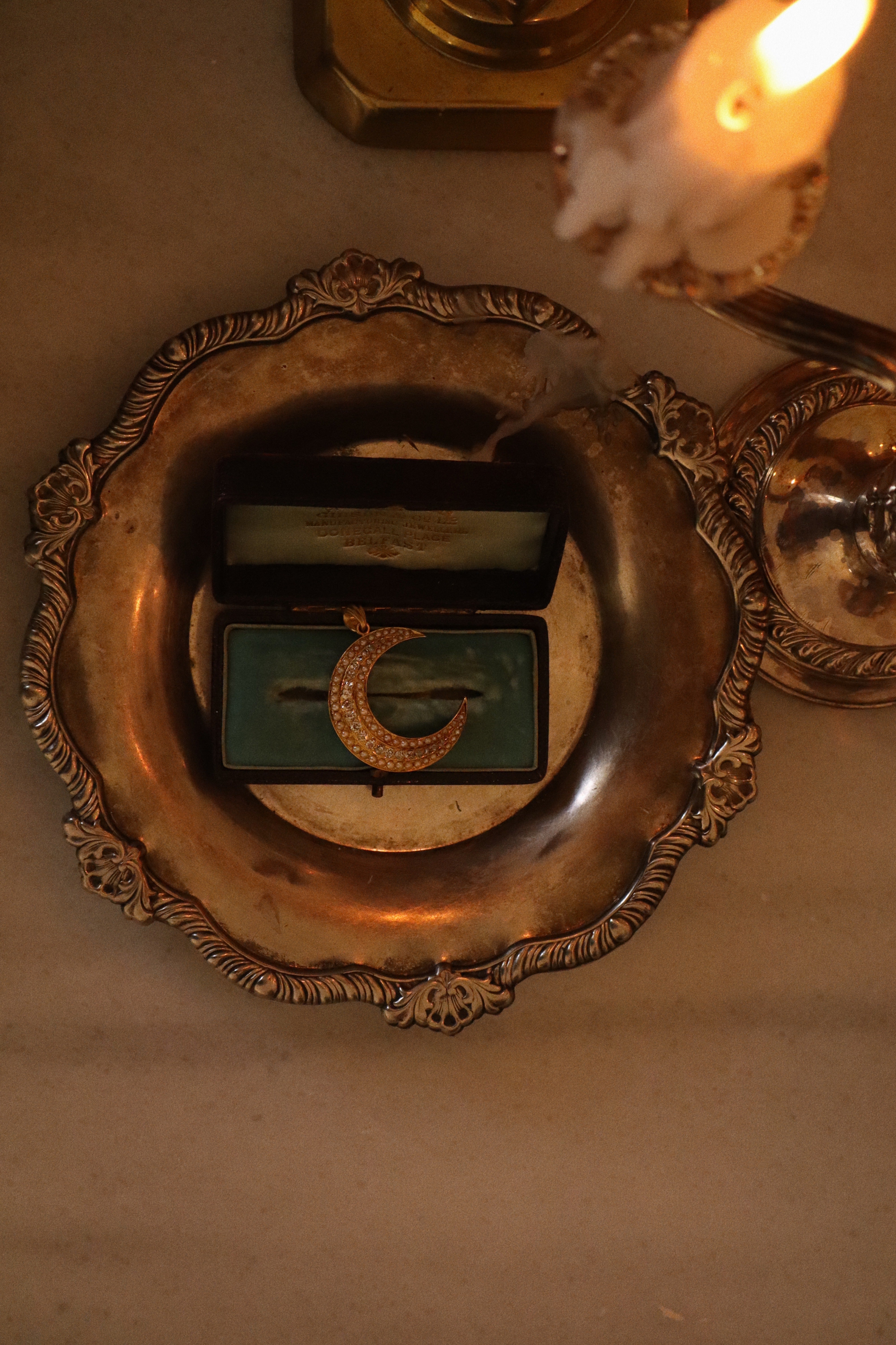 We are over the moon for this antique crescent pendant. Its rows of luminescent pearls flash with tones of peach, silvery gray, and ivory. In Edwardian jewelry, bright diamonds and pearls were often combined for their elegant and refined look. Historically, crescents like this symbolize the moon's influence and the divine feminine--wear her to celebrate your cosmic intuition with style.