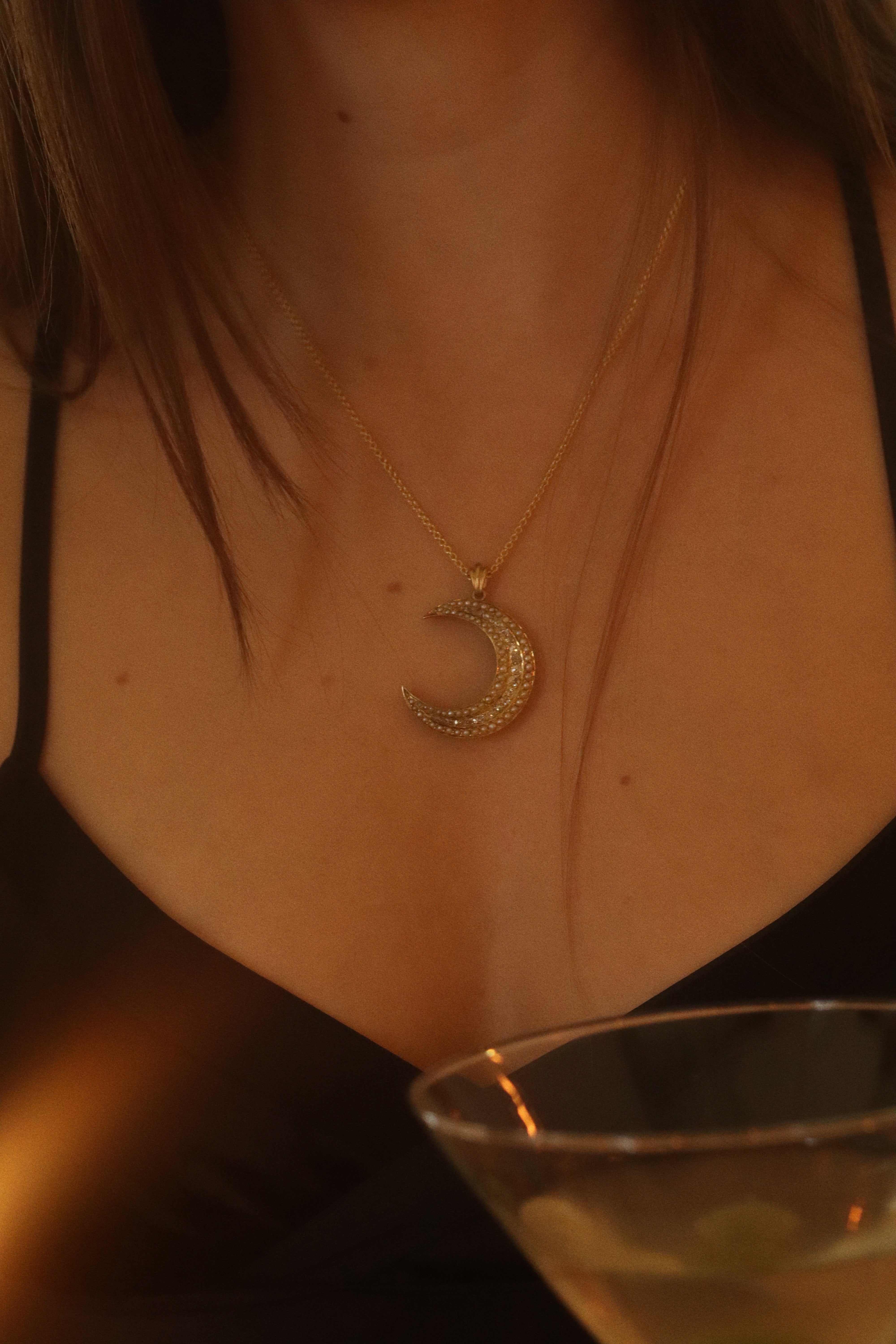 Our Crescent Pendant No. 5 is an authentic antique diamond and pearl crescent pendant from the Edwardian Era, circa 1890. The pendant features approximately 0.42 carats of Old Mine Cut and Rose Cut diamonds of I-J color, VS-SI clarity. Two additional rows of natural seed pearls surround the diamonds. The stones are all set in 14kt Yellow Gold. We attached our 18kt Yellow Gold bale to slide it onto our 18-inch classic 18kt Yellow Gold chain. The pendant is approximately 1.75 inches.