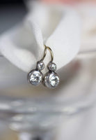 The Belmond earrings are an authentic pair of Edwardian Drop Earrings. Each earring has two old European cut diamonds. The diamonds combine for approximately 0.90cts (larger are approximately 0.35 carats each and the top ones are approximately 0.10 carats each) and are approximately I-J in color, SI2-I1 clarity. The diamonds are bezel-set into a silver-topped 14kt yellow gold collet setting.