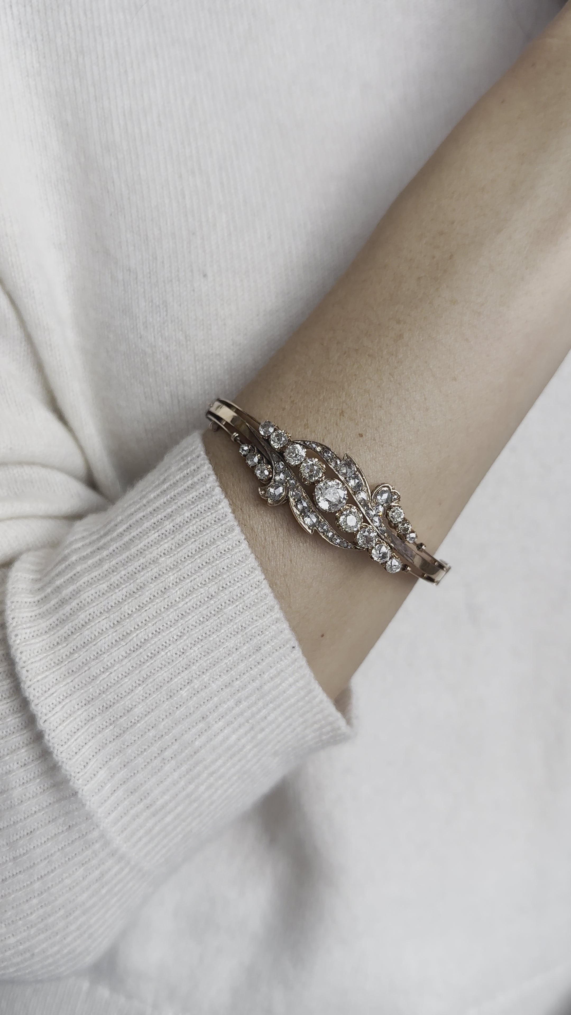 The Sigfrida bracelet is an authentic vintage diamond bangle from the Edwardian era circa 1900. The bangle centers an Old Mine cut diamond of approximately 0.80 carats, H color, VS-SI clarity. An additional 41 old mine and rose cut diamonds of approximately H-I-J color, VS-SI clarity are prong set into the 12kt rose gold setting all combining for approximately 2.40-carats.