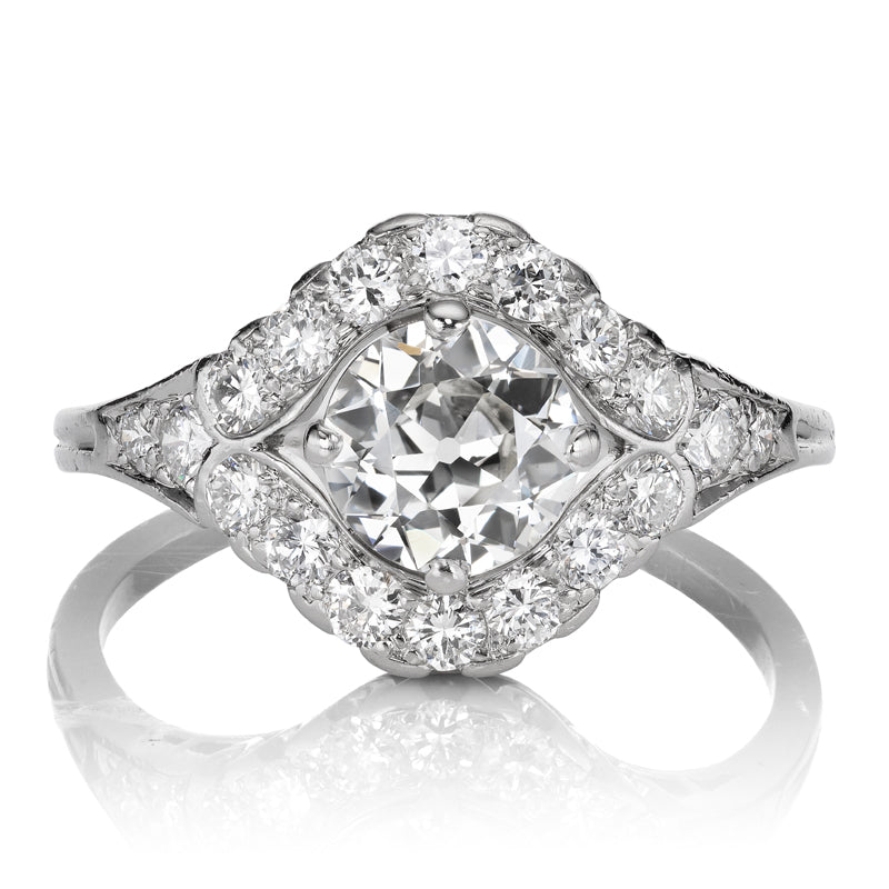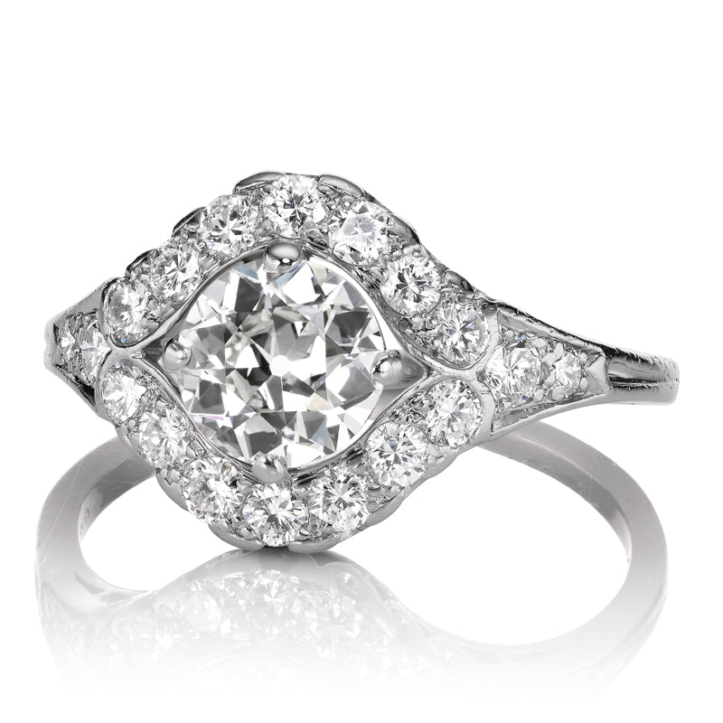 The Sabre ring is a vintage Tiffany & Co. ring circa 1940. The ring centers a GIA-certified 1.04 carat Old European Cut diamond of J color, VS1 clarity. The stone is set in a Platinum setting with intricate metalwork detailing on the basket. A halo of 18 additional Round Cut diamonds, which combine for approximately 0.90 carats of similar color and clarity, surrounds the center stone and continues onto the shoulders. The ring is stamped "Tiffany & Co." on the interior of the band. The ring is currently size 8 and can be resized!