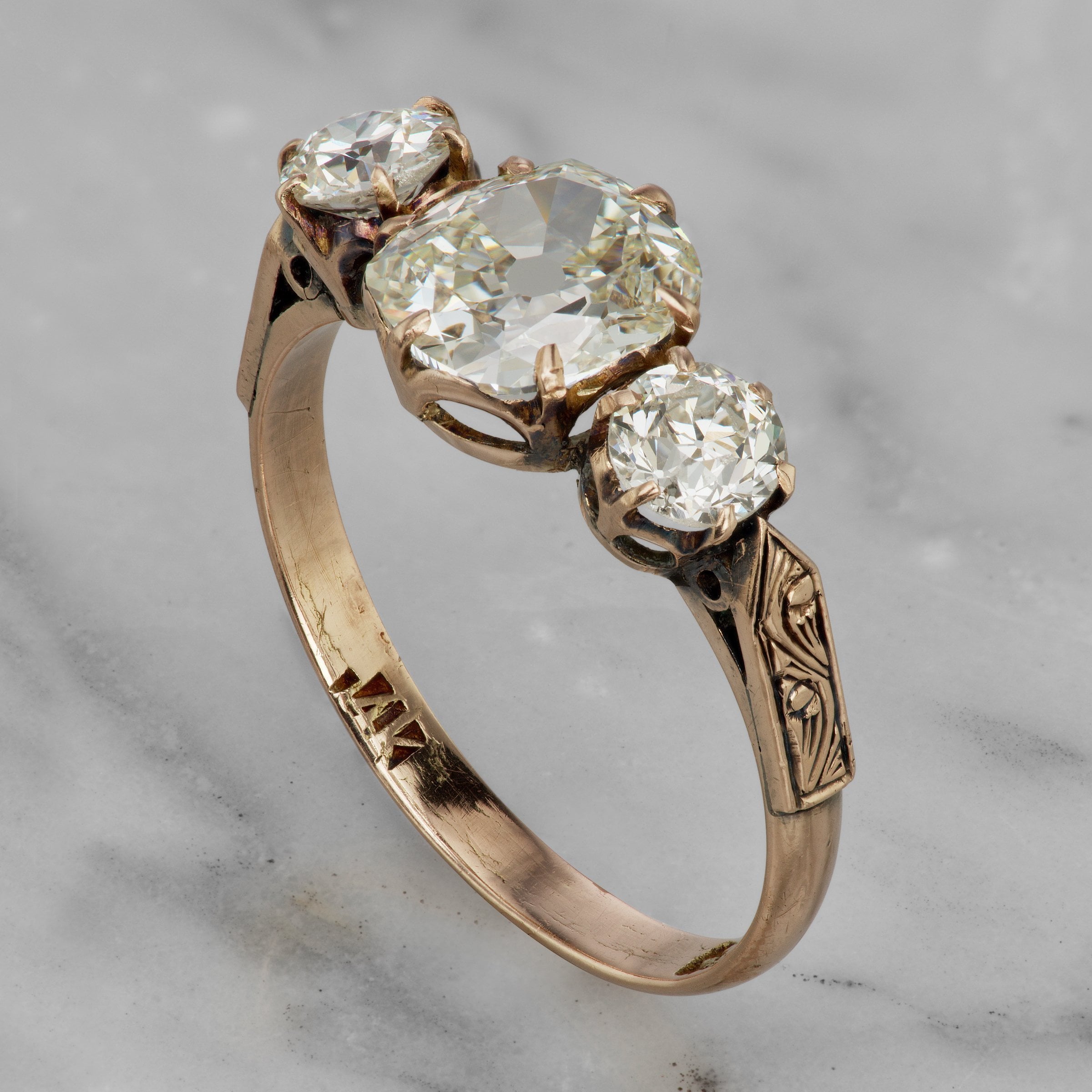 Antique Engraved 3 Diamond Engagement Ring