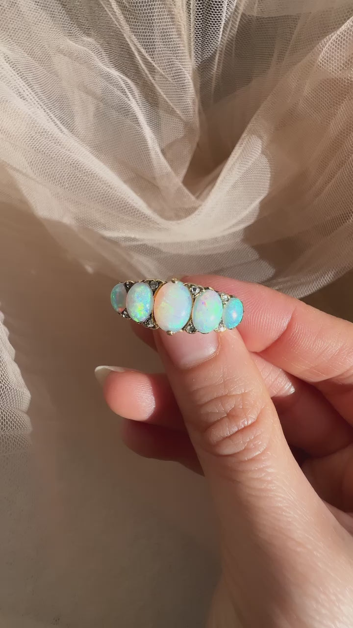 The Faith ring is an authentic vintage opal and diamond ring from the Victorian Era circa 1890. This GIA-certified ring features 5 Cabochon Opals prong set in a beautiful handmade 18kt yellow gold setting. The opals combine for approximately 1.50-carats. Eight small rose cut diamonds are set between the opals, adding the perfect touch of glamour to this wonderful cocktail ring. The ring is currently size 8.5 and can be resized!
