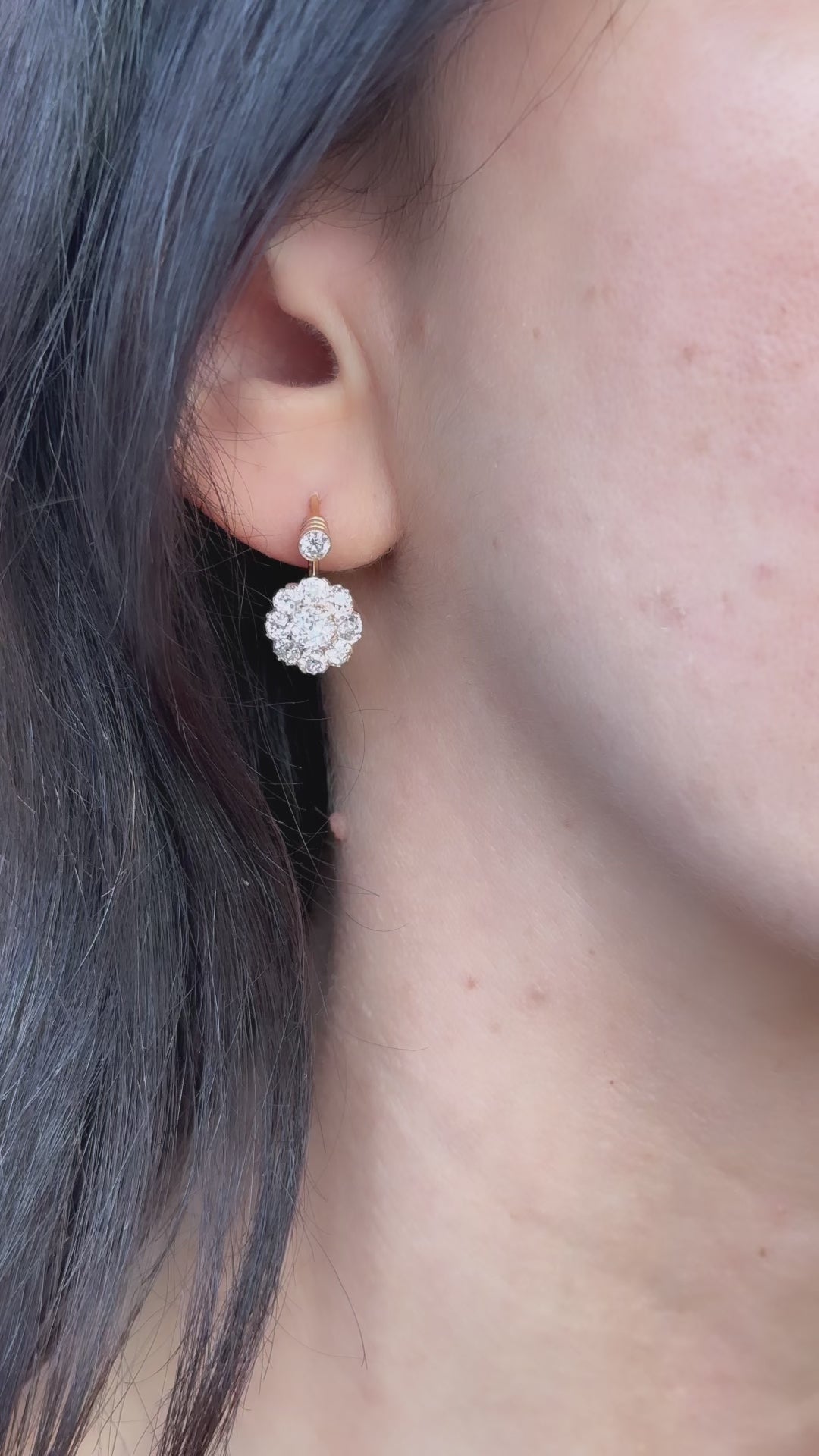 Gorgeous diamond clusters in rosy-hued gold drop just below the ear for a feminine and alluring look. Whether worn for a little everyday glamour or for a special event, these earrings have a place in our dream jewelry box without a doubt.