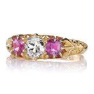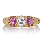 Good things come in threes, and the Roman ring certainly follows that rule! We love finding antique half hoops like these. The dark pink of the rubies contrasts perfectly with the bright white old mine-cut stone to create such a unique and vibrant piece.