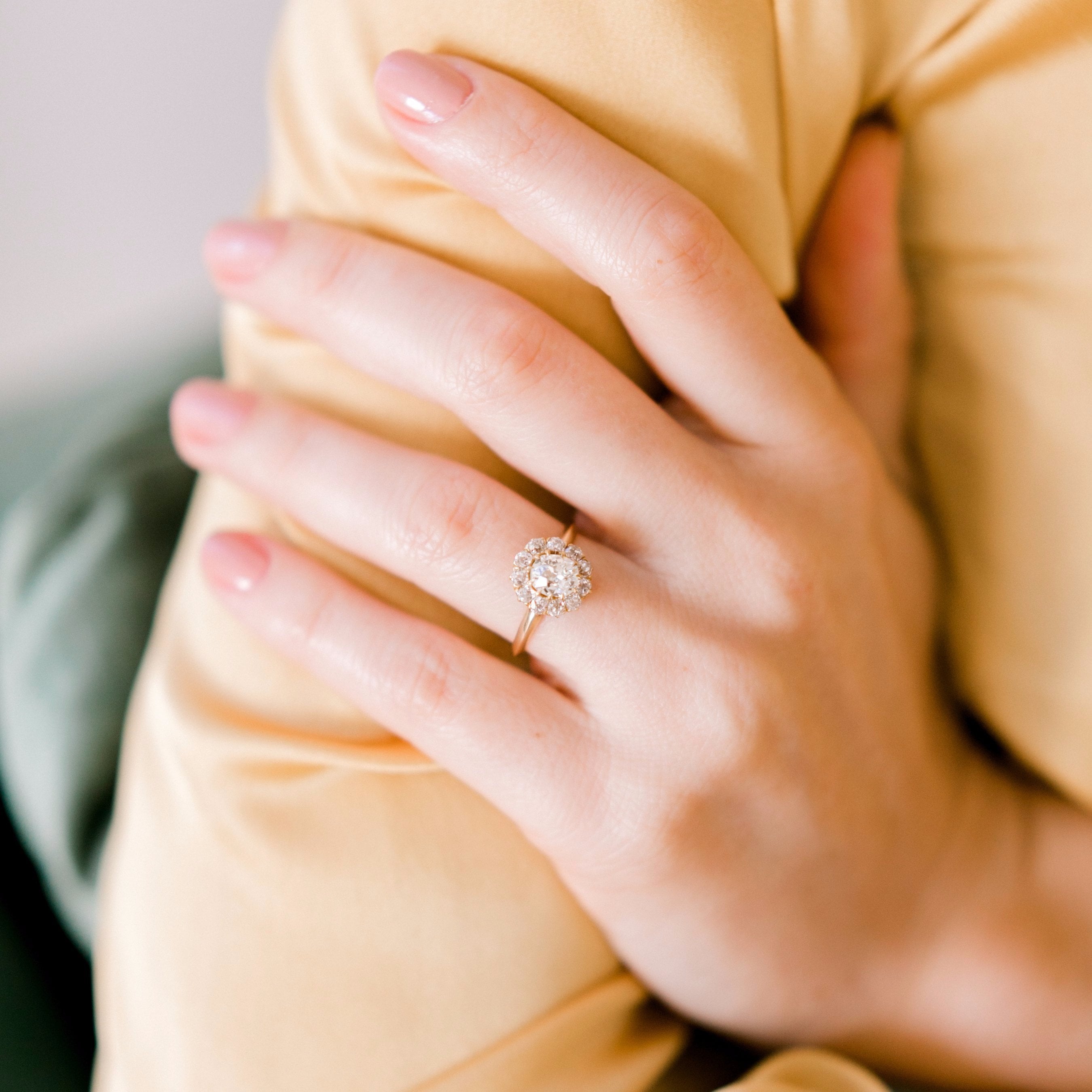 Old mine cut clusters are always winners in our book, especially when they look this good! Gorgeous warm hues come from the metal and the diamonds and the slightly knife-edged band adds extra dimension!
