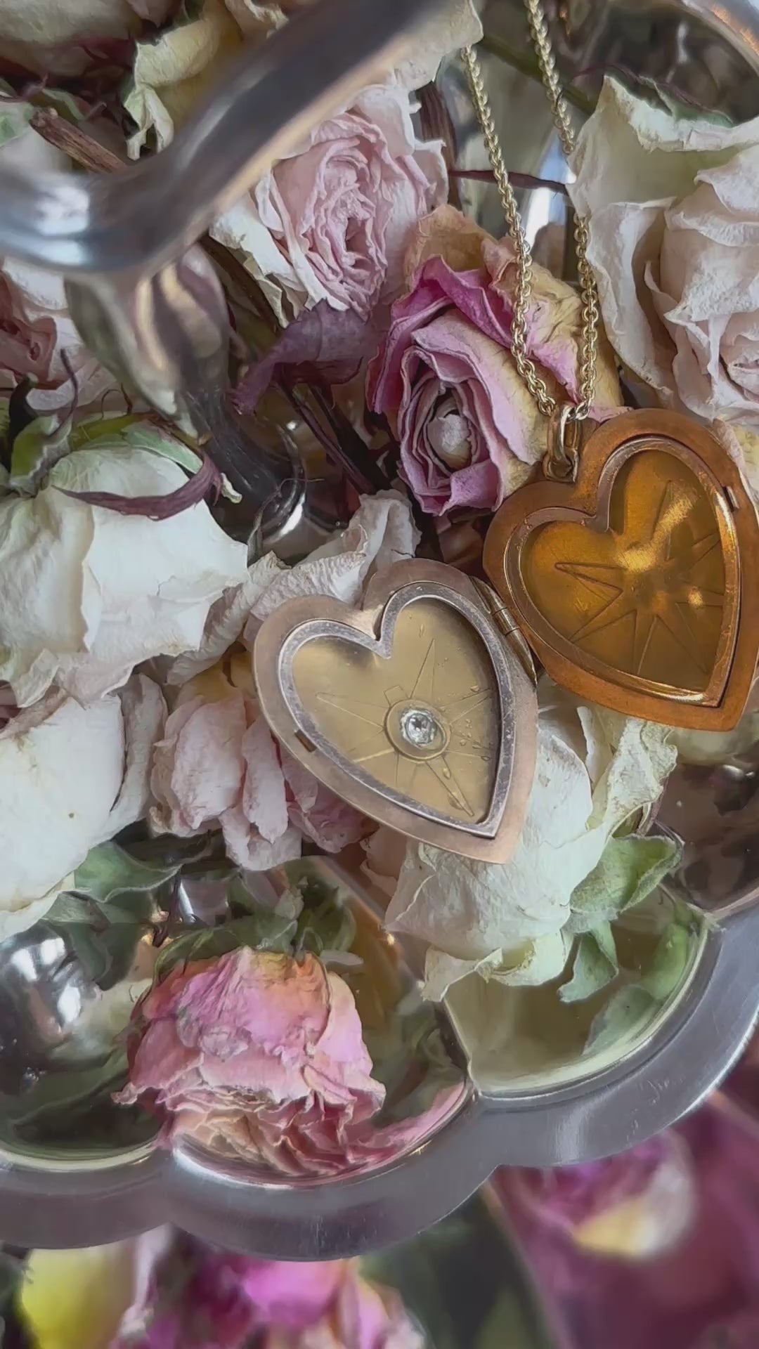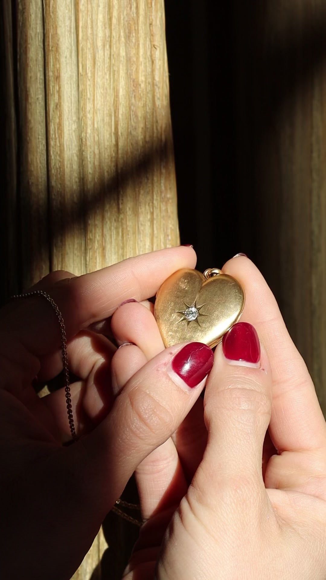 The Bardot Pendant is an authentic antique heart locket from the Victorian Era circa 1890. The pendant centers a 0.30 carat Old Mine Cut diamond of approximately I-J color, SI clarity. The stone is set in a 10kt Yellow Gold heart locket pendant with a starburst engraving.