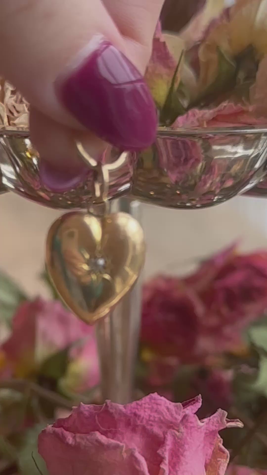 The Starling Pendant is an authentic antique heart from the Victorian Era circa 1890. The pendant centers a 0.05 carat Old European Cut diamond of approximately I-J color, SI clarity. The stone is set in a Yellow Gold heart pendant with a starburst engraving surrounding the center stone.