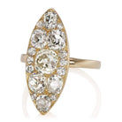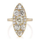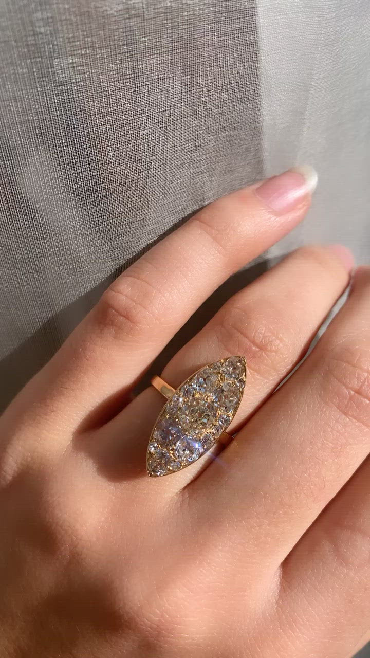 The Vicky ring is an antique navette engagement ring from the Edwardian era, circa 1910! This incredible piece centers an old mine cut diamond weighing 1.14 carats of K-L color, SI2 clarity. The central diamond is surrounded by an additional 16 old mine cut diamonds that are bead set in a navette-shaped 18 karat yellow gold setting. The side diamonds combine for approximately 3.55 carats for a total carat weight of 4.69 carats. The gallery has scalloped open metal work. The ring is size 6 and can be resized!