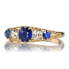 The Aveline ring is an authentic vintage sapphire and diamond ring from the Victorian Era circa 1886. The ring features three No Heat Cambodian Sapphires totaling approximately 0.75 carats, alternating with two Old Mine Cut diamonds of approximately M-N color and eight tiny Rose Cut diamonds, together totaling 0.45 carats. The stones are set in an 18kt yellow gold with hallmarks indicating its origin of Birmingham, England. The ring is currently size 9.25 and can be resized!