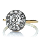 The Elestren ring features an authentic antique diamond cluster (originally from a necklace but recently converted to a ring) from the Victorian Era circa 1850. The ring centers an Old Mine Cut diamond of approximately H-I color, VS-SI clarity and weighing roughly 1.00-carat. The stone is set in a two-tone silver and 18kt yellow gold closed-back setting. A halo of 12 Old Mine Cut diamonds surrounds the center stone of coordinating color and clarity, all combining for approximately 0.40-carats. The ring is currently size 5 and can be resized!